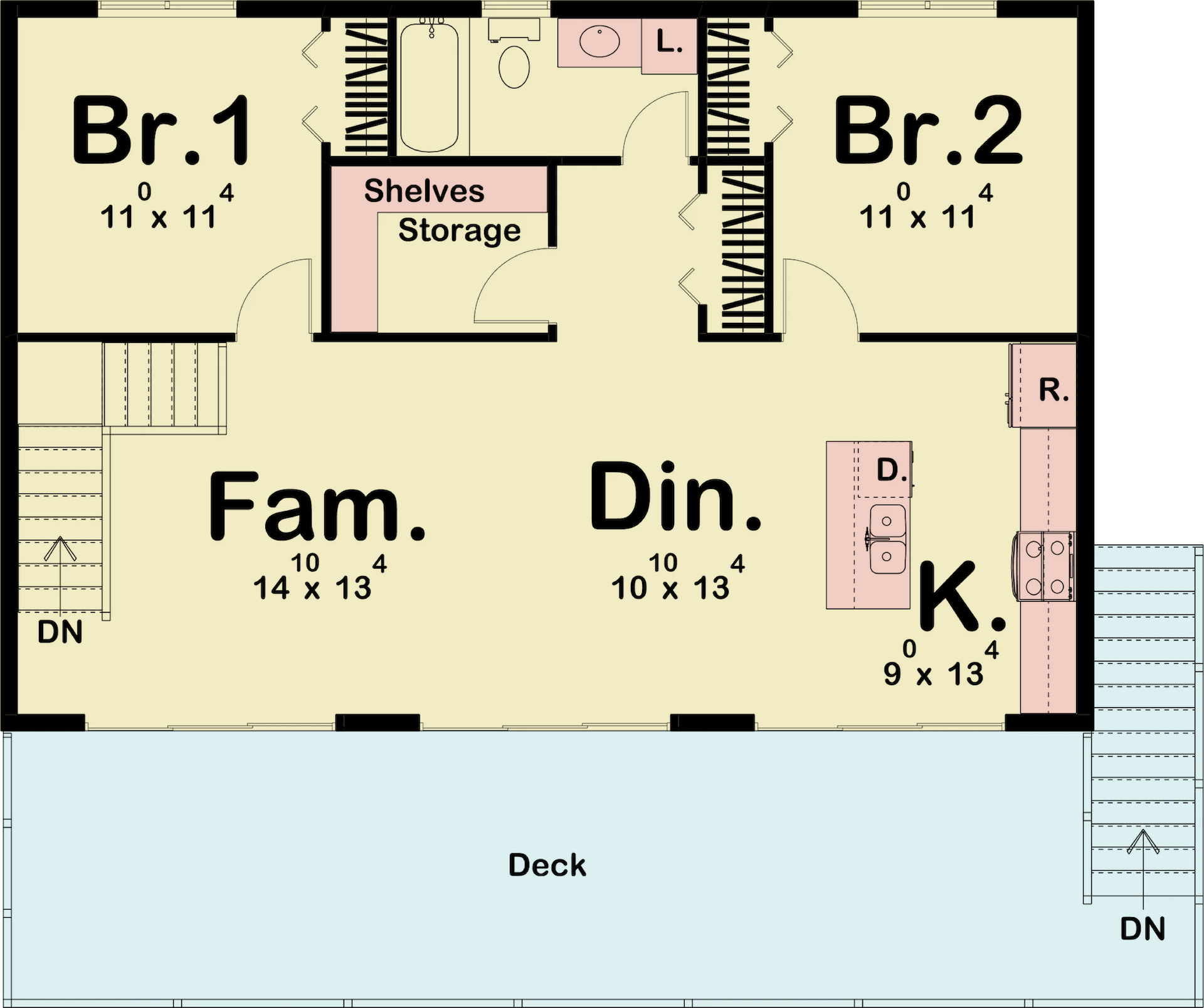 An optional finished basement increases the plan by 735 Sq Ft and adds great features like a 3rd bedroom, a table room for your pool table, a large additional family room and an unfinished storage room. The overall dimensions include a 10' deep deck and a 4' wide staircase.