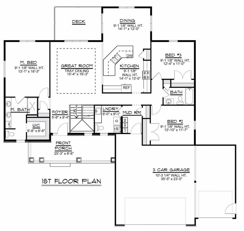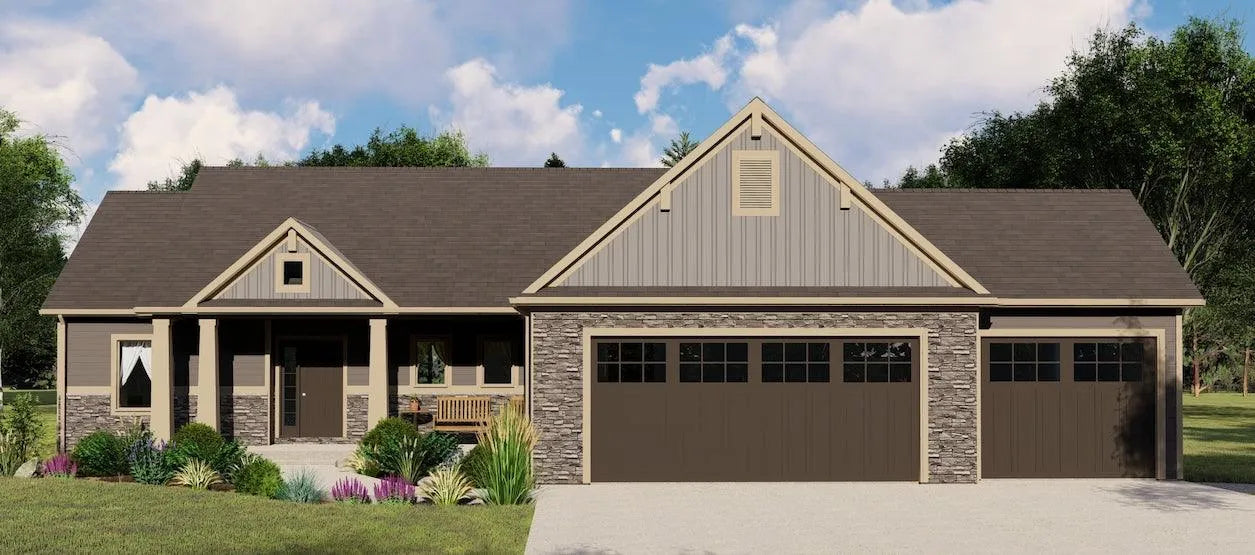 This Craftsman Ranch Home Planfeatures just over 1,800 square feet of living space and presents a split-bedroom design, while the unfinished basement provides ample storage space.Tapered pillars support the front porch, which welcomes you into the foyer. A tray ceiling is located above the great room straight ahead with a trio of windows that overlook the back deck.The combined kitchen and dining area creates a comfortable space for everyday cooking and dining, with an angled island that hosts a double-bowl sink, pantry, and loads of workspace.The master bedroom occupies the left side of the home, and includes a 4-fixture bath with a walk-in closet. Bedrooms 2 and 3 are tucked behind the 3-car garage, separated by a full bath, which they share.Built-in lockers and a coat closet in the mudroom help keep your outdoor gear organized, and the neighboring laundry room includes a utility sink.