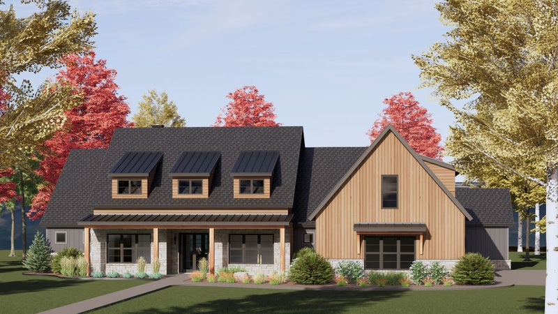 The expansive outdoor living spaces include a 287 sq. ft. front porch and a 779 sq. ft. rear porch complete with an outdoor kitchen and fireplace, perfect for hosting gatherings year-round. The three-car side-entry garage and mudroom enhance functionality, while design details like 10-foot ceilings and a 9:12 roof pitch add a sense of grandeur. This modern farmhouse blends cozy charm with contemporary amenities, offering the ideal environment for relaxed, stylish living.