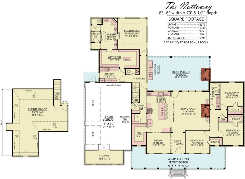 This thoughtfully designed house plan offers a total living area of 2,979 square feet, with the entire first floor dedicated to functional living. The layout features four bedrooms, two full bathrooms, and one half bathroom, making it ideal for families. A generous bonus room of 811 square feet provides extra space for entertainment or relaxation. The home includes a side-loading garage measuring 905 square feet, accommodating three vehicles and providing additional storage options. Built on a sturdy slab foundation with 2x4 wall framing, this residence features a brick exterior for durability and aesthetic appeal. With dimensions of 83 feet 6 inches in width and 79 feet 5 inches in depth, the house stands at a height of 28 feet 4 inches. The first floor boasts a ceiling height of 10 feet, enhancing the open and airy feel throughout the living spaces.