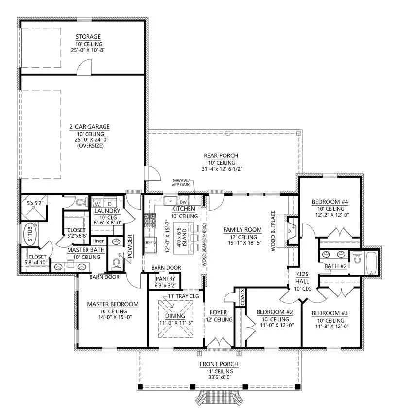 Step in to this thoughtfully designed house plan that offers a total heated living area of 2,175 square feet, all situated on the first floor. The home features a generous total porch area of 662 square feet, perfect for outdoor relaxation and entertaining. Additionally, there is a dedicated storage space of 313 square feet, providing ample room for belongings. The garage, measuring 632 square feet, includes two bays and is accessed from the side for convenience. Inside, the layout encompasses four bedrooms, two full bathrooms, and one half bathroom, accommodating families comfortably. Built on a slab foundation, the house utilizes 2x4 wall framing and stick roof framing with a roof pitch of 9:12 and 17:12. The home measures 74 feet 1 inch in width and 75 feet 10 inches in depth, standing at a height of 27 feet. The first-floor ceiling height varies between 10 and 12 feet, while the garage ceiling height is 10 feet, creating an inviting atmosphere throughout.