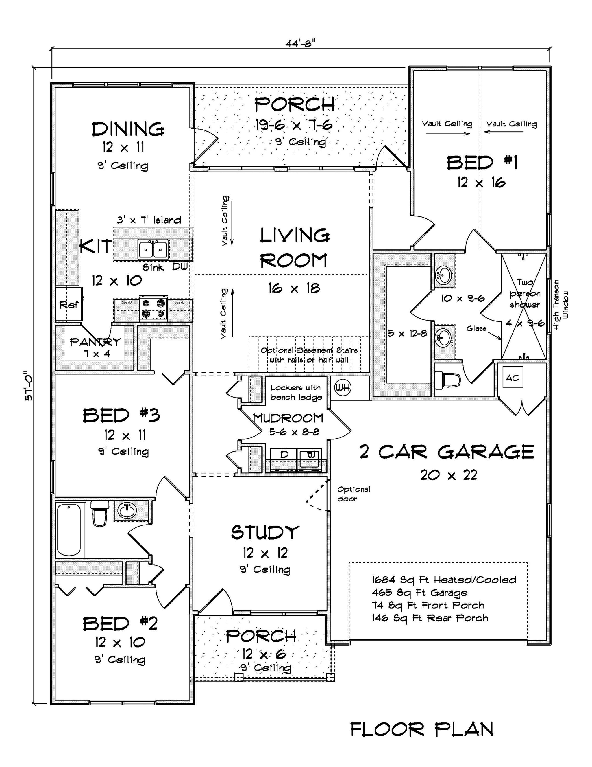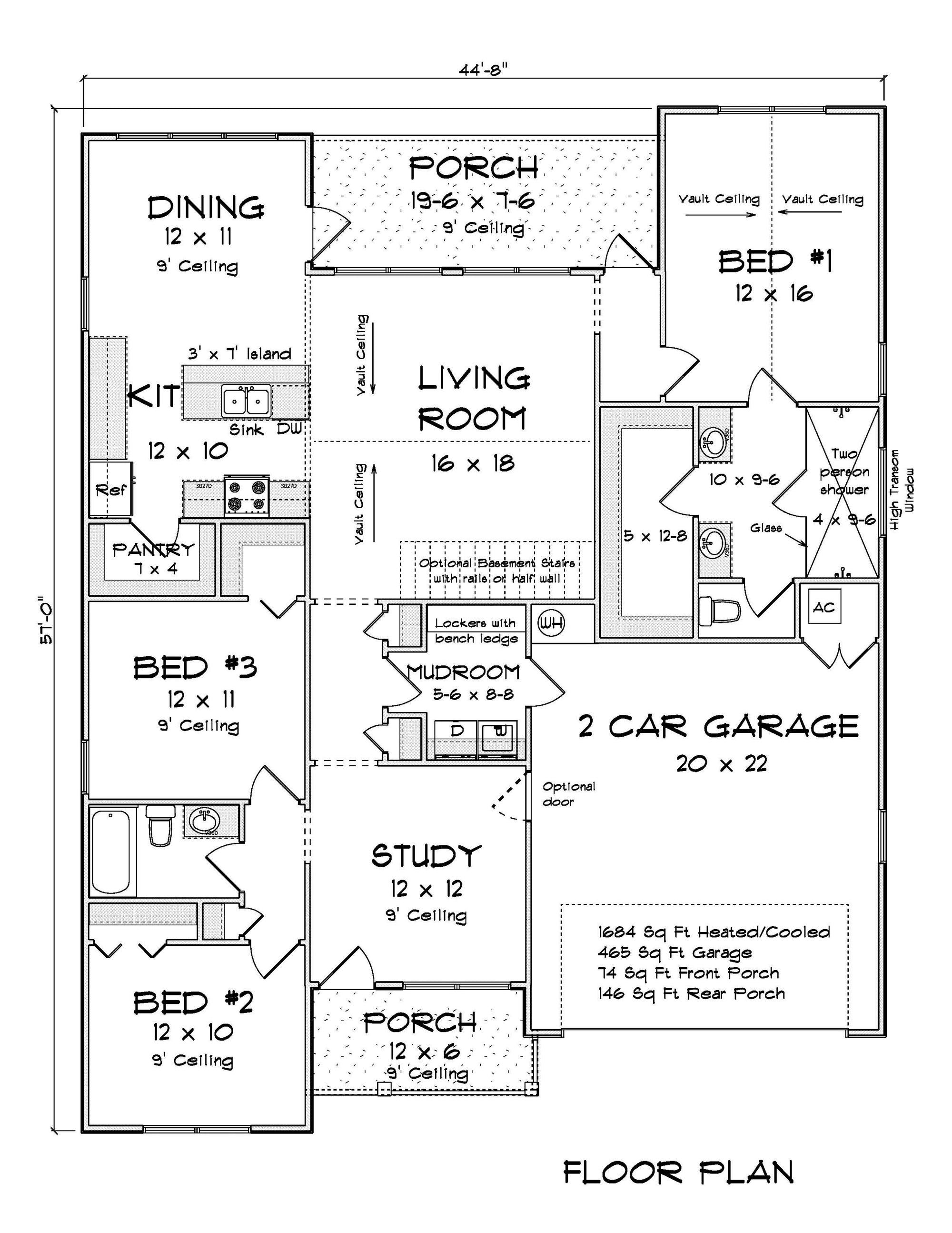 • Floor Plan: Includes electrical layout, window/door sizes, floor joist span direction, and ceiling type notes (e.g., 9' ceiling, vault).