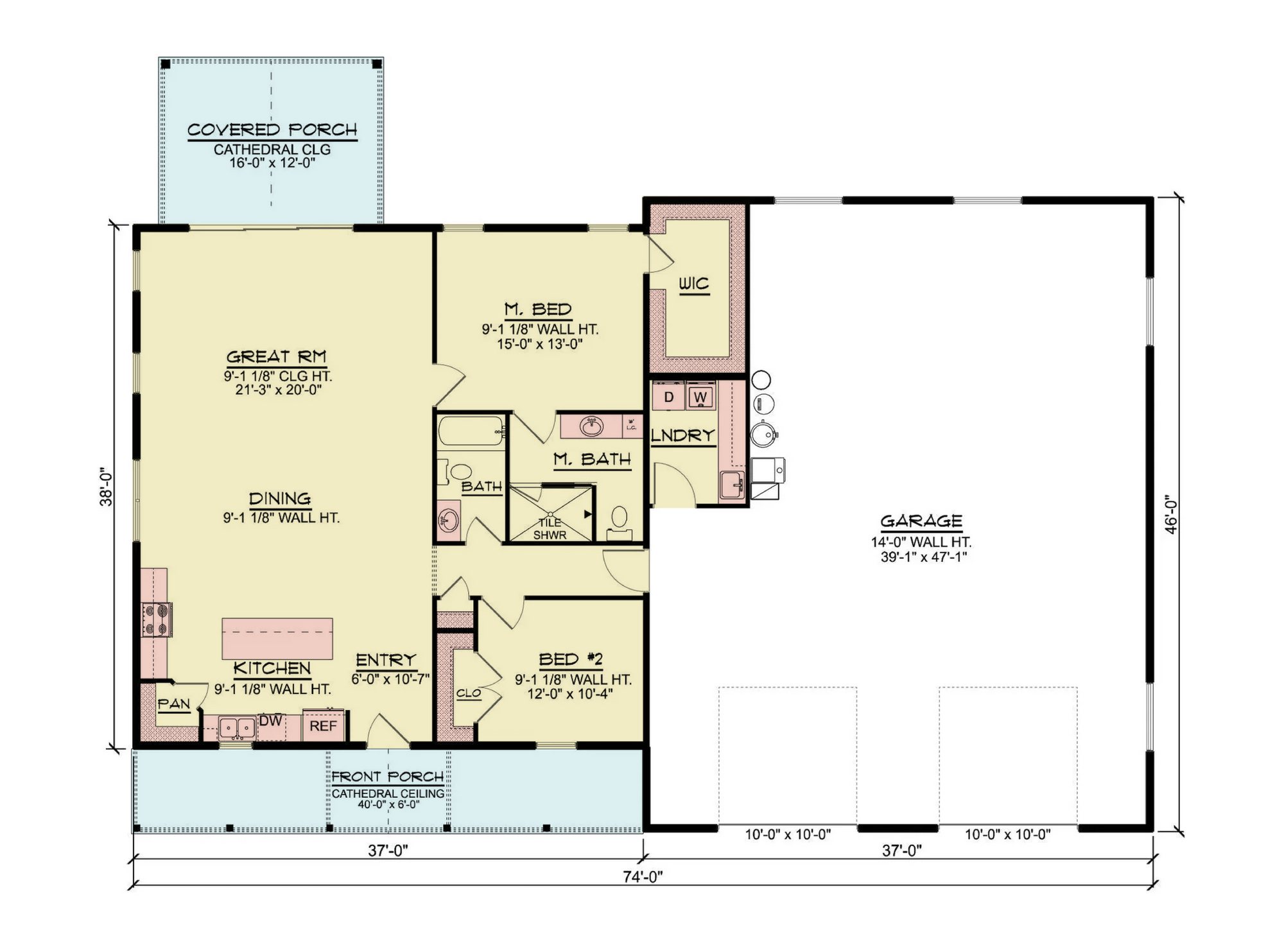 This house plan features a total living area of 1,614 square feet, all situated on the first floor, which provides a convenient and accessible layout. Complementing the living space is a spacious garage measuring 1,519 square feet, designed with two bays for parking vehicles and ample room for storage. The garage is front-loaded for easy access from the street. Inside, the home includes two bedrooms and two bathrooms, ensuring comfort and privacy for its occupants. The structure is built on a durable slab foundation, with wall framing made of 2x6 lumber that enhances both strength and insulation. The roof is supported by trusses, providing efficient structural integrity. With a width of 74 feet and a depth of 56 feet, the house offers a generous footprint, and its overall height reaches 20 feet 8 inches, creating a substantial presence. The first-floor ceiling height of 9 feet adds to the sense of spaciousness, making the living environment feel open and inviting.