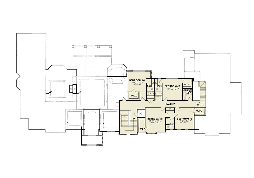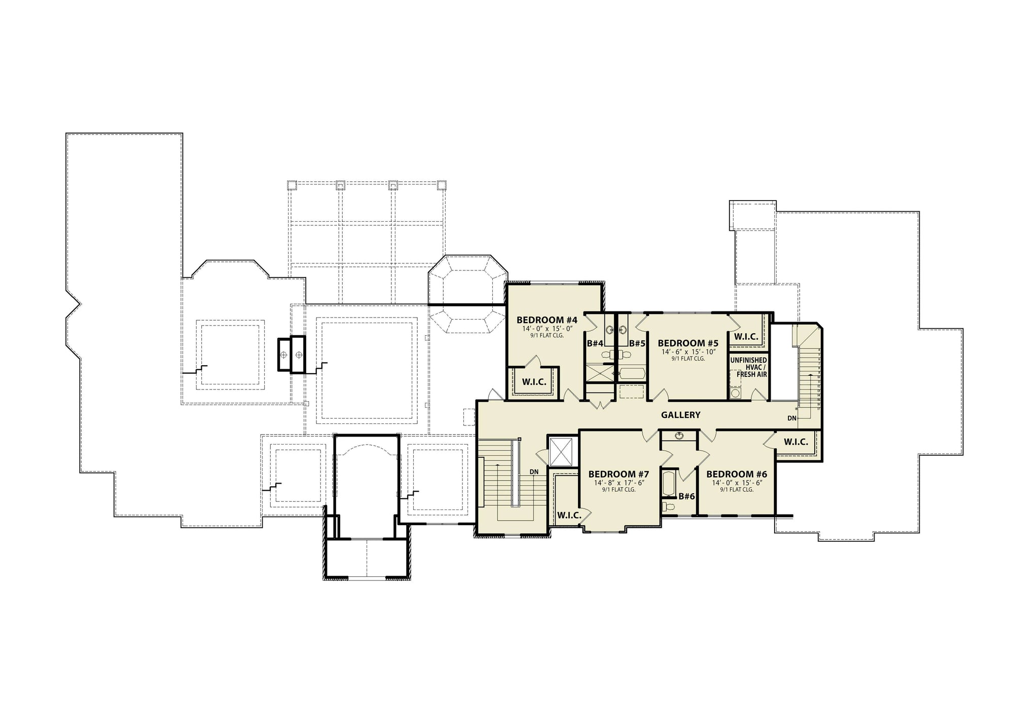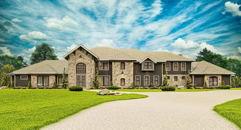 This stunning house plan offers an expansive total living area of 8,339 square feet, thoughtfully designed across two levels. The first floor features a generous 6,295 square feet, showcasing seven bedrooms and six bathrooms, including two half baths, making it ideal for large families or those who love to entertain. The elegant layout includes a grand entrance that leads to a spacious great room with vaulted ceilings, a formal dining room, and a cozy breakfast area. The well-appointed kitchen boasts a large island with an eating bar and a walk-in pantry, perfect for culinary enthusiasts. The first-floor owner's suite offers a luxurious retreat, complete with his and hers closets, a master bath featuring a double vanity sink, and a sitting area for relaxation.