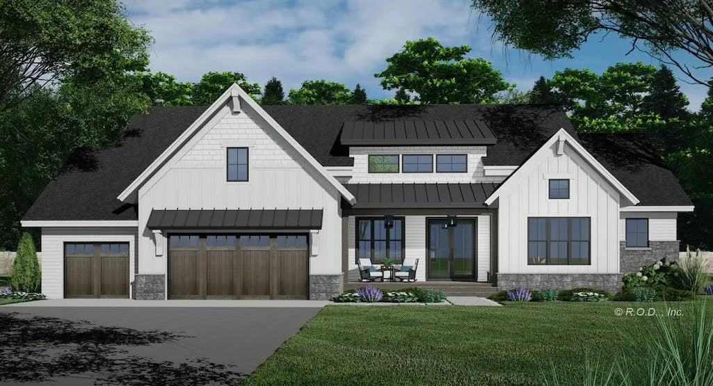 This 2176 sq ft contemporary farmhouse offers a perfect blend of modern design and rustic appeal. It features 2 bedrooms, 2 ½ bathrooms and a 3-car garage. The exterior showcases a captivating combination of wood, stone and steel, creating an eye-catching façade.