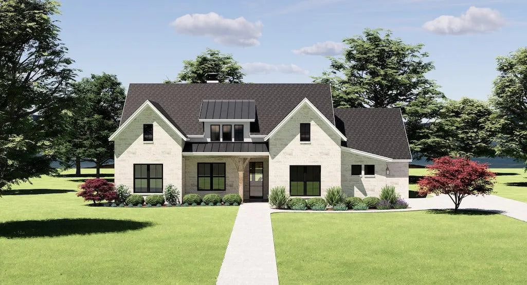 Welcome to this one-story house plan spans 2,646 sq ft of well-designed living space, combining elegance and practicality. The open floor plan features 10-foot ceilings, enhancing the spacious feel of the main living areas. Four bedrooms and three bathrooms ensure comfort and privacy, with a split-bedroom layout separating the owner's suite for added tranquility. The owner's suite also features direct laundry access, simplifying daily routines. The kitchen includes a walk-in pantry, while a connected mudroom and laundry area add functionality and storage.
