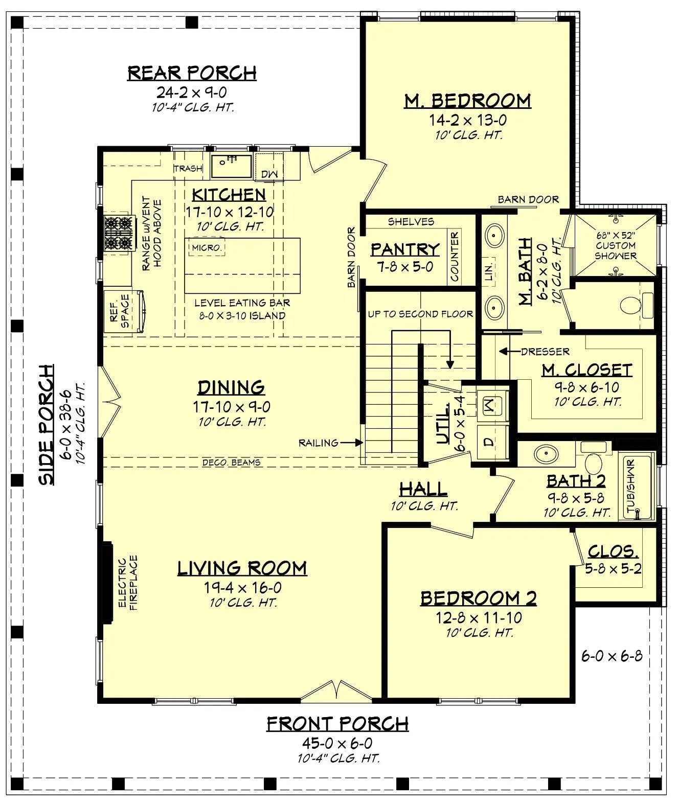 This charming house plan features a total living area of 2,235 sq. ft., with 1,569 sq. ft. on the first floor. The open floor plan boasts 10-foot ceilings and includes a spacious kitchen with a large island, eating bar, and butler's pantry, perfect for entertaining. A cozy breakfast area and a fireplace in the living room add warmth and character. The first-floor owner's suite features a luxurious bathroom with a double vanity and a walk-in closet. Upstairs, the 666 sq. ft. second floor includes three additional bedrooms and a loft area. Outdoor living is enhanced with a covered front porch, rear porch, and wraparound porch. Built on a slab/crawl foundation with a stylish brick exterior, this home combines elegance and practicality.