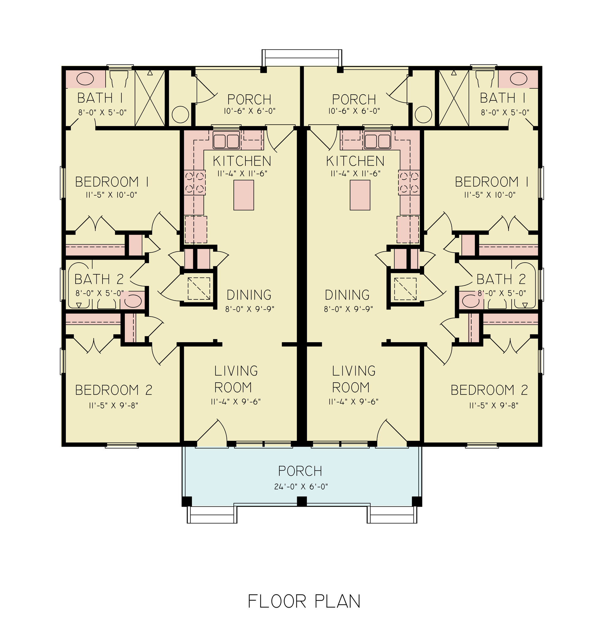 This charming duplex-style home offers a total of 1696 sq ft of heated living space, evenly divided between two units. Each unit provides 848 sq ft on the first floor, featuring 2 bedrooms and 2 bathrooms, making it an ideal setup for families, guests, or rental opportunities. The open-concept layout includes a modern kitchen with an island and a walk-in pantry, enhancing functionality and storage. Both units enjoy private access to a covered front porch and a cozy rear porch, perfect for outdoor relaxation. With 2x4 wall framing, stick roof framing, a 7:12 roof pitch, and an 8' first-floor ceiling height, this beautifully designed duplex offers comfort and style in a compact footprint.