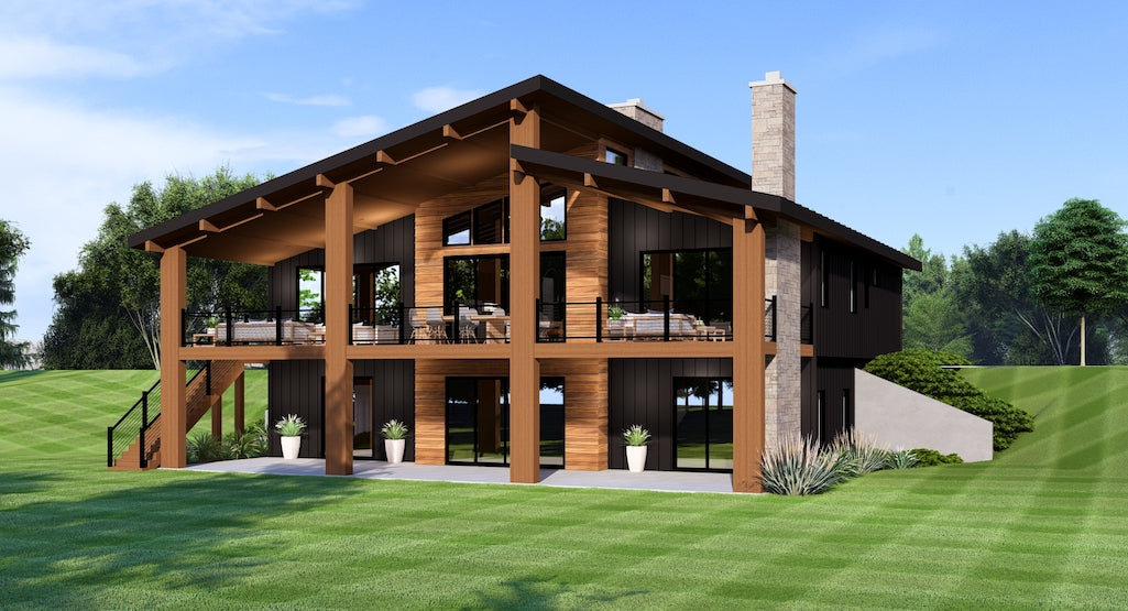 This modern home design is ideal for your rear-sloping lot, this expandable lake or mountain house plan is all about the back side. The ceilings slope up from the right and left sides to the left-center wall running along the master suite. The rear of the large great room features floor to ceiling windows looking out across the vaulted 14'-5" deep covered deck. The kitchen and master bedroom each have their own access to the rear deck through sliding glass doors. Bedrooms are separated for privacy, with access to the secondary bedroom on the right side of the entry foyer. A full bath is located conveniently behind a pocket door, and is shared with the main living area.