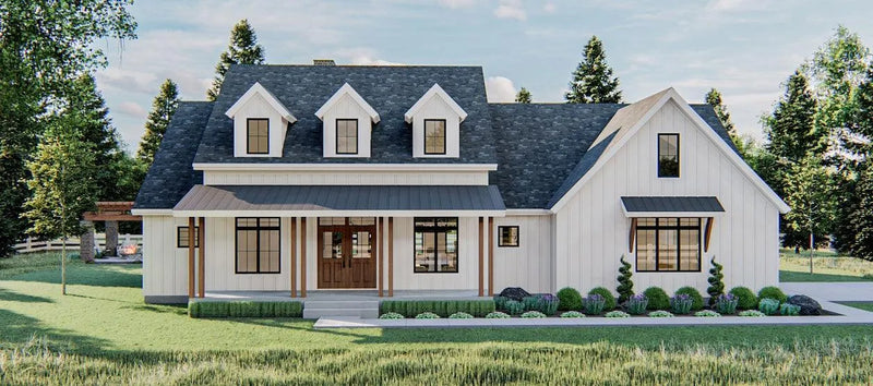 The Bridgeport is a beautiful Modern Farmhouse style plan. The exterior features 3 dormers for that classic farmhouse look. You'll be blown away immediately when you step inside this home. The entry lies under beautiful exposed beams. Just to the right of the entryway is a formal dining room that is perfect for entertaining guests. The kitchen and great room lie under a soaring cathedral ceiling and flow perfectly in the open floor plan. The great room is warmed by a fireplace that is flanked by built-in bookshelves. The kitchen includes a large island and a walk-in pantry. The master suite is situated on the right side of the home and includes a soaking tub, his/her vanities, and a large walk-in closet that has access to the laundry room. On the left side of the home, you'll find 2 bedrooms, each with their own walk-in closet. A wonderful sunroom off the rear of the home leads to a large covered patio.