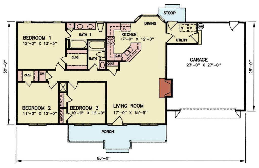 Built with durable 2x4 exterior wall framing and a classic 7:12 stick-framed roof, this home also includes a 612 sq ft front-load garage with an 18’x8’ door for easy access. The home measures 66' wide by 39' deep, with a ridge height of 19’6”, making it ideal for both compact and wide lots. Finished in classic siding with architectural shingles, this design is perfect for anyone seeking a traditional home with modern comforts and ranch-style simplicity. Whether you're downsizing, starting fresh, or just love efficient layouts, this home delivers big on value and everyday livability.