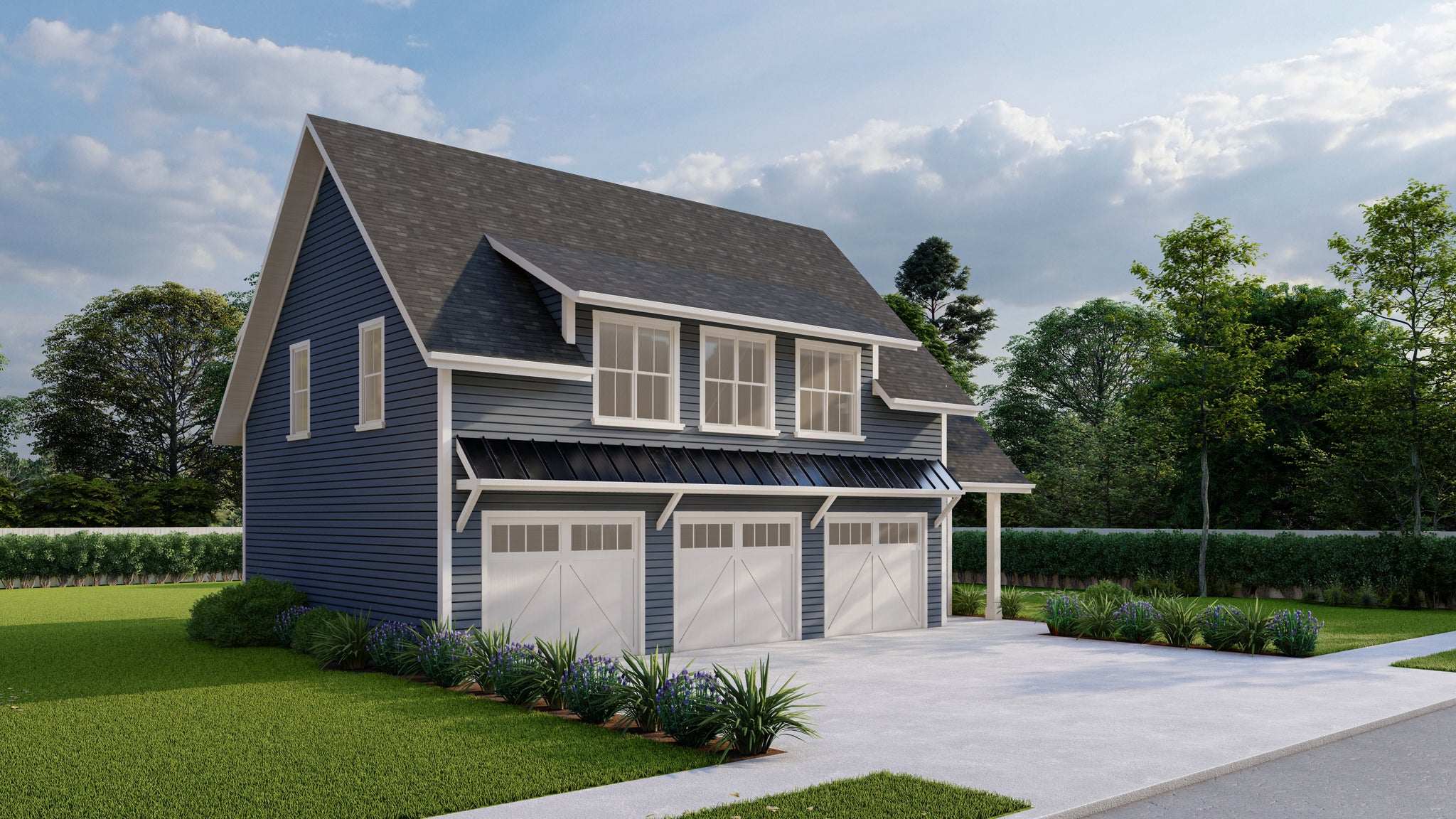 This charming 1-bedroom carriage house plan offers 1,196 square feet of heated living space above a spacious 3-car garage, combining functionality with modern style. Ideal as a guest suite, rental unit, or studio-style living space, the upper floor includes a large master suite with a walk-in closet, full bath, and convenient second-floor laundry. The open-concept layout also features a kitchen with island seating, a cozy keeping/family room, and a dedicated home office or study.