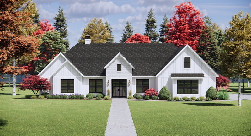 This 3,116-square-foot modern farmhouse combines timeless charm with functional design, offering 4 bedrooms and 3.5 bathrooms all on a single level. The split bedroom layout ensures privacy, while the first-floor master suite features a spa-like bathroom, walk-in closet, and convenient laundry access. Two additional bedrooms share a Jack and Jill bathroom, perfect for families.