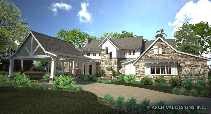 An impressive carport and fire pit courtyard welcomes guest as they approach the Grazia del Signore rustic house plan. The foyer opens up to an expansive 2-story family room with large windows that maximize views. The chef's kitchen offers a large island for entertaining and oversized pantry with overstock storage.