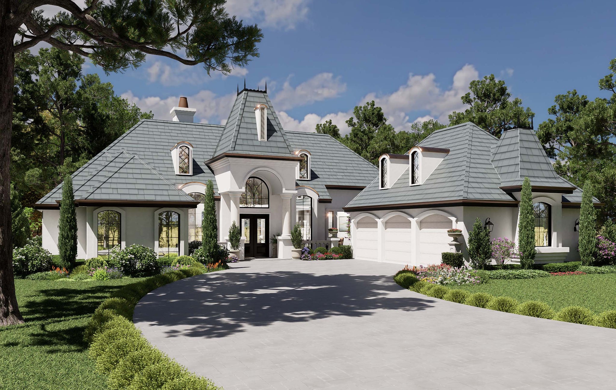 This French Country–inspired home beautifully blends rustic warmth and refined elegance, offering 3,329 sq. ft. of living space all on one level. The home’s graceful rooflines, stone and stucco exterior, and charming veranda capture the romantic spirit of the French countryside while maintaining modern functionality.
