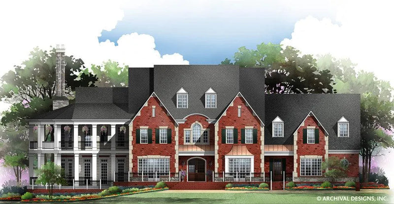 Two other bedrooms with private baths are located on the second floor, as well as an office and a studio, for the photographer or artist in the household. The first floor includes a guest suite, an island kitchen, and a library. A three-car garage with adjoining storage areas caps this exquisite plan.