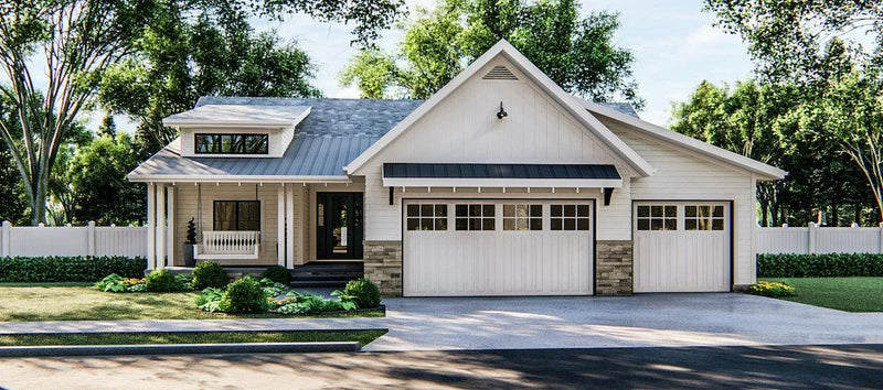 The Brenna house plan is a Modern CottageRanch with a functional floor plan and unique exterior. It combines the eclectic use of cottagecore materials, not too unlike the craftsman style, with elegant modern elements - standing seam metal over the porch, shed dormer and garage roofs, an uncluttered look and feel. Doesn't it look great?