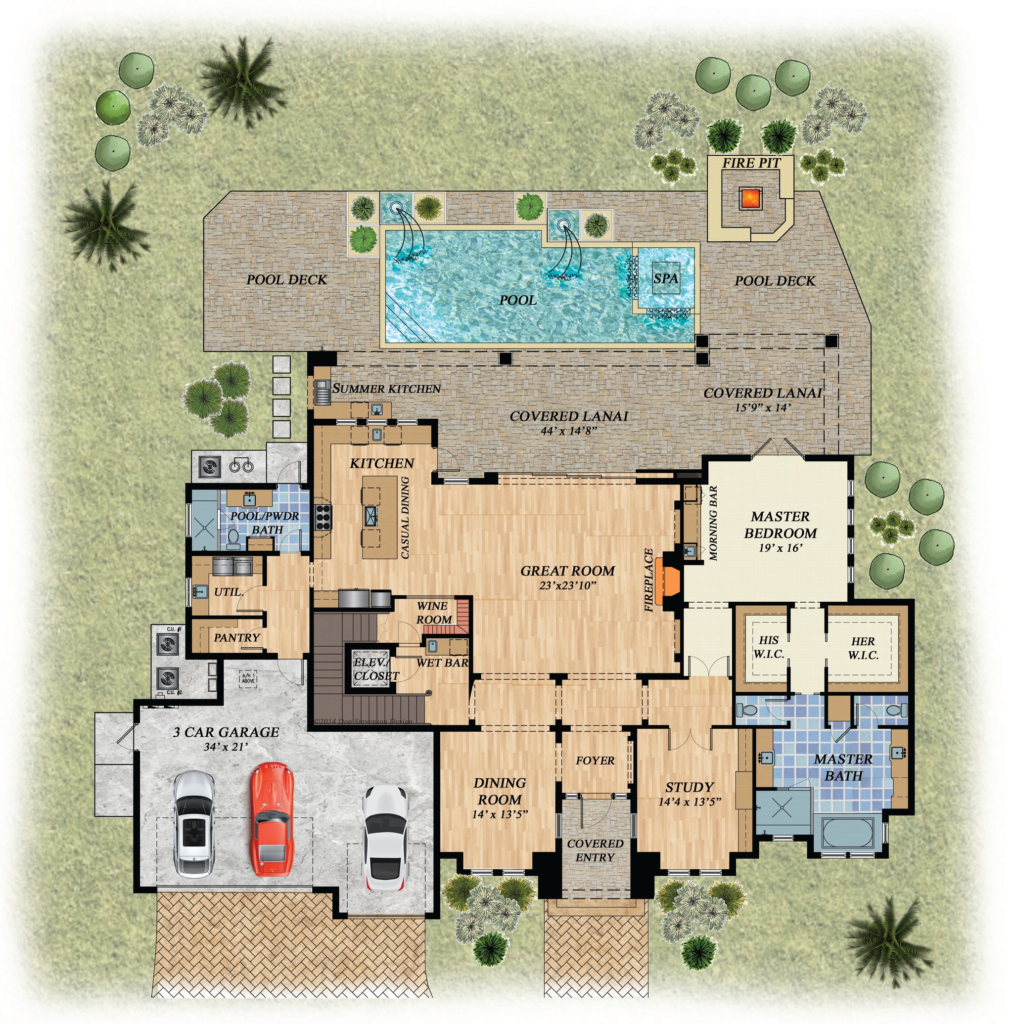 This 4,080 sq. ft. luxury home perfectly combines sophistication, comfort, and smart design across two levels. The 2,856 sq. ft. first floor features an open-concept layout centered around a spacious great room with vaulted ceilings and a cozy fireplace. The gourmet kitchen includes a large island, butler’s pantry, and walk-in pantry, making it ideal for hosting and family gatherings. The first-floor master suite is a serene retreat with his-and-hers walk-in closets and a spa-like ensuite bath. Additional highlights include a private home office, guest suite, and direct access to a covered lanai complete with a fully equipped outdoor kitchen—perfect for alfresco entertaining.