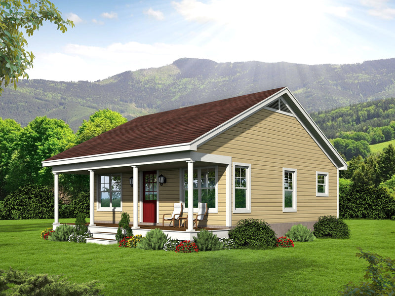 The home is built on a slab or crawl foundation and is framed with 2x4 walls. The roof has a 6:12 pitch, and the building stands at 16'9" tall with an 8-foot ceiling height on the first floor. A covered front porch invites you to enjoy outdoor relaxation, making this home a great choice for anyone looking for a compact, functional design with modern features.