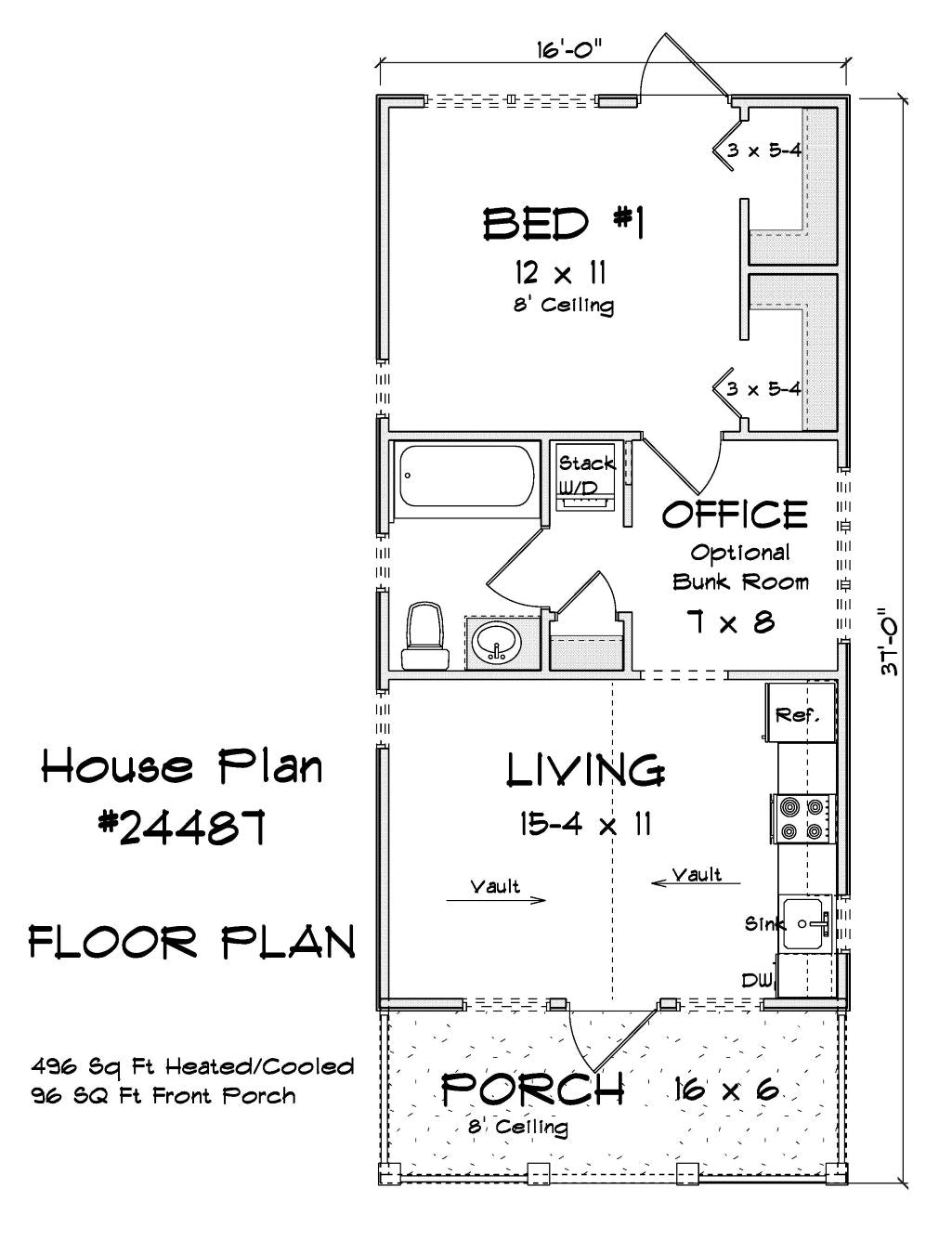 This one-story cottage guest house offers 496 square feet of well-designed living space, perfect for a tiny home, guest suite, or office. The open-concept layout is enhanced by a vaulted great room, providing an airy, spacious feel in the main living area, which flows seamlessly into the kitchen. The cozy master suite includes a 5-by-8-foot bath and a closet, offering essential storage.