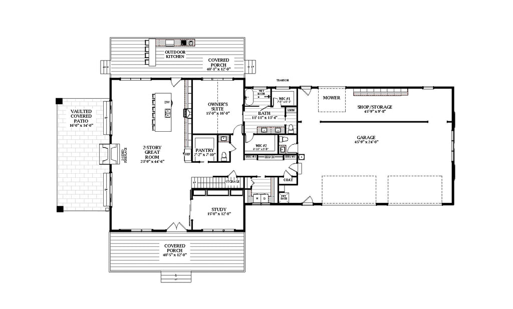 Outdoor living is a priority, with a 974 sq ft porch area, an outdoor kitchen, and an outdoor fireplace, perfect for entertaining. The 1,145 sq ft front-load garage features space for 4 vehicles and includes a dedicated workshop for hobbyists or extra storage.