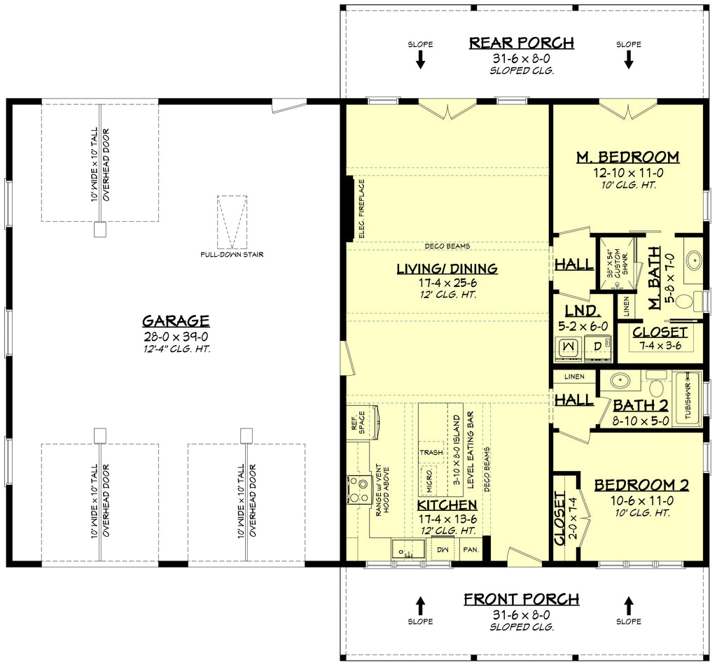 The master suite features a private bath and walk-in closet, while the second bedroom offers flexibility for guests or a home office. Outdoor living is a highlight with 252 sq. ft. front and rear porches, perfect for relaxing or hosting gatherings. The impressive 1,140 sq. ft. 4-car garage provides ample space for vehicles, hobbies, or a workshop—making this plan an ideal choice for those who love barndominium living with plenty of room to breathe.