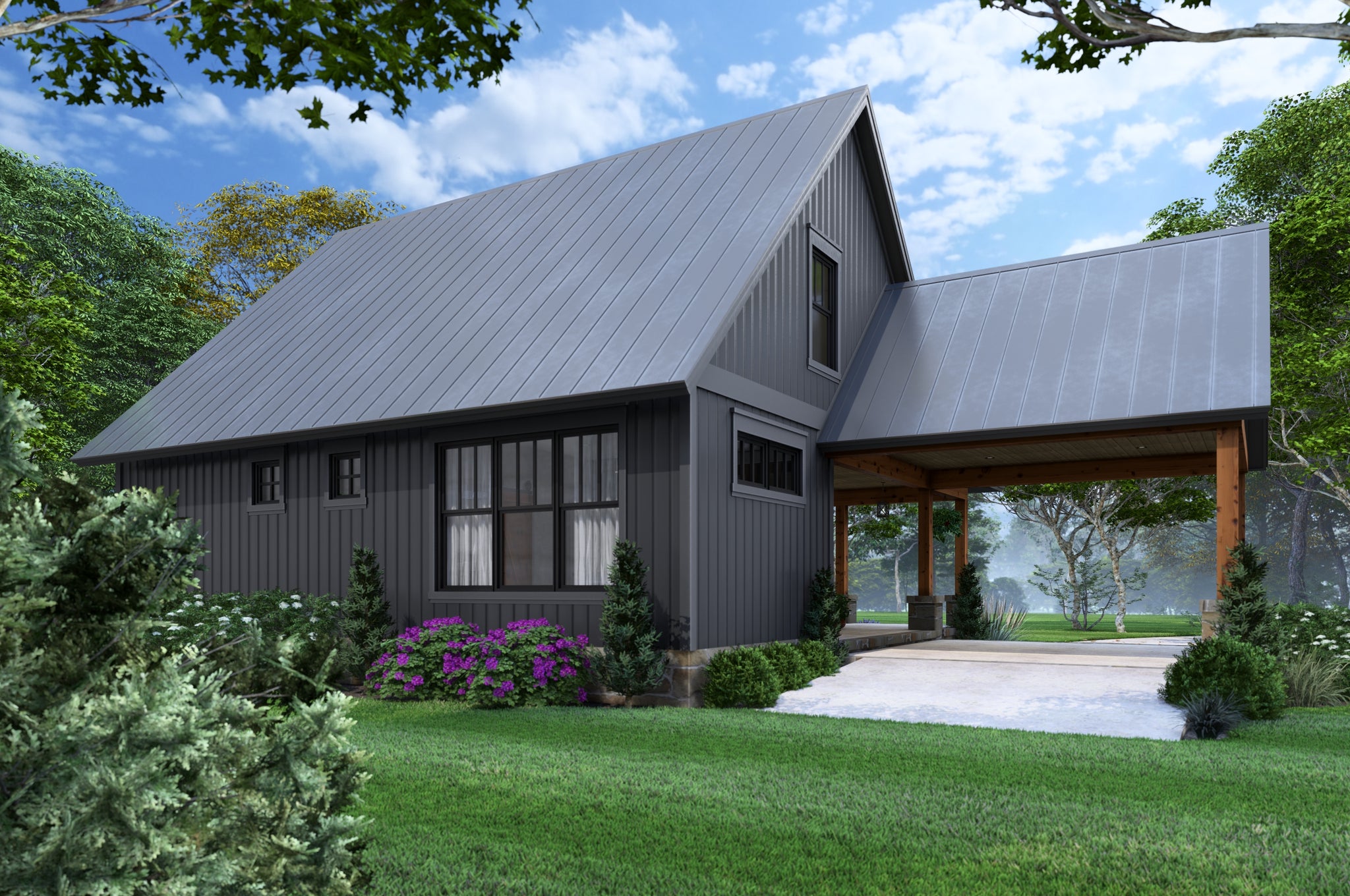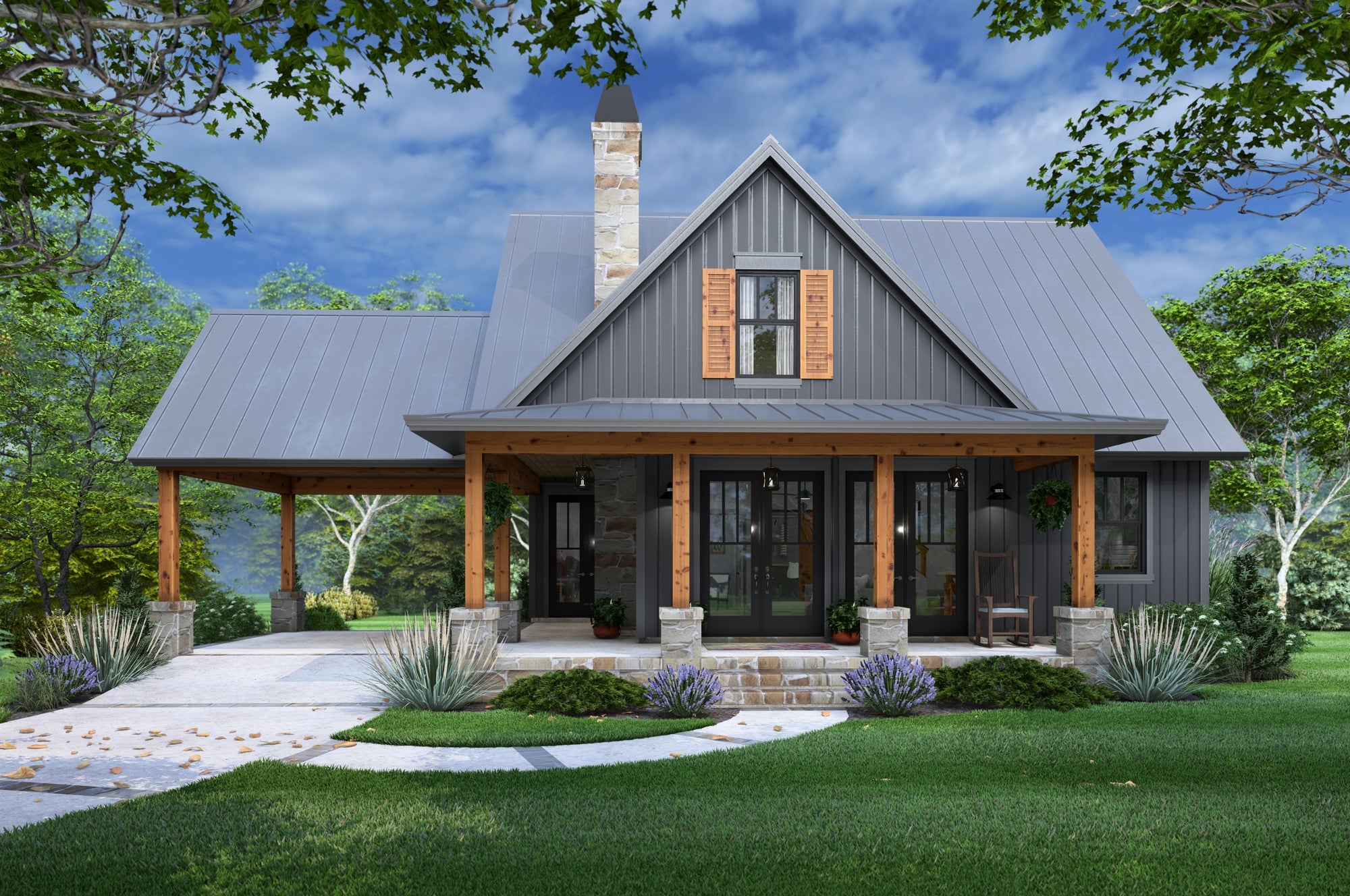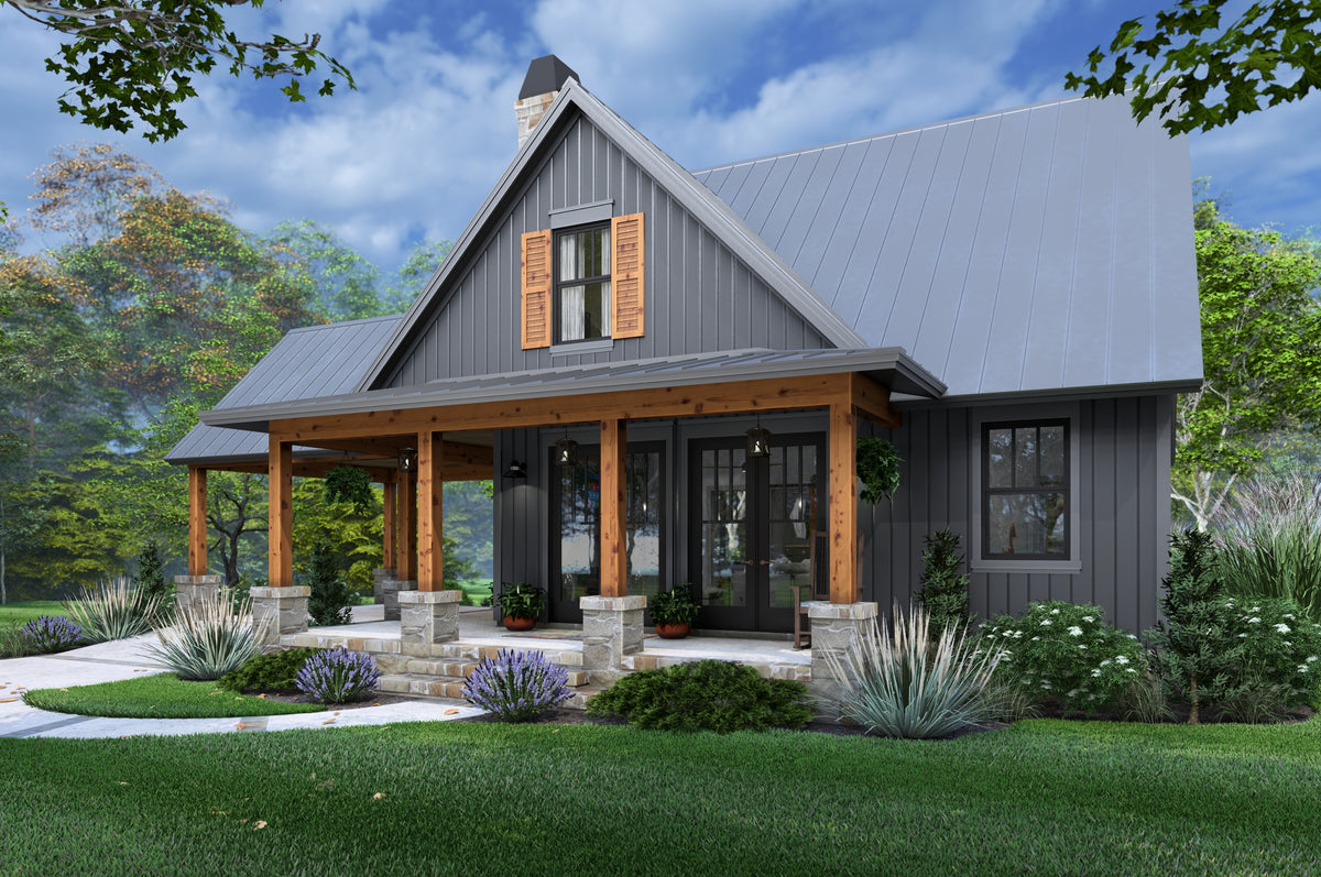 Upstairs, three additional bedrooms offer comfort and flexibility, whether for family, guests, or a home office. A front-load carport and 287 sq ft of porch space add welcoming curb appeal and convenience, while the compact design fits neatly on smaller lots. With its 12:12 pitched roof, classic style, and smart layout, this slab-on-grade home is a charming solution for those who want efficient living with a touch of elegance.