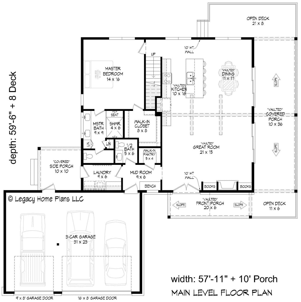 Upstairs, you'll find two additional bedrooms, each with its own bath access, and a versatile loft perfect for a home office, game room, or secondary lounge. A large mudroom connects to the 3-car front-load garage, keeping daily life organized. With a total house width of 57'11" plus a 10' porch and depth of 59'6" plus an 8' deck, this home offers generous space inside and out. Vaulted ceilings, wraparound porches, and a blend of roof pitches (12:12 and 3:12) complete the picture—making this home a standout choice for both style and livability.