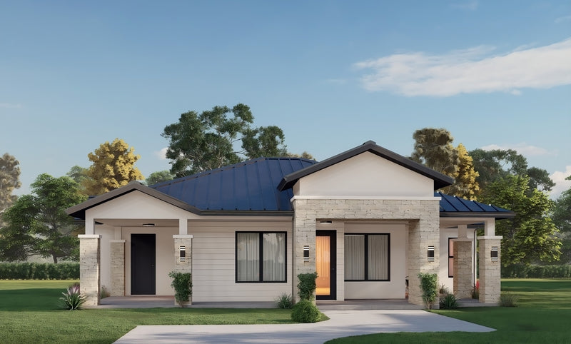 This 1,453 sq ft single-story home delivers style and comfort in a smart, functional layout. Set on a 55'6" wide by 45'3" deep footprint, it features two full master suites—ideal for multi-generational living, guests, or a luxurious private retreat. The inviting wraparound front porch (600 sq ft) and low 5:12 roof pitch create a relaxed, ranch-style curb appeal that's both timeless and welcoming.