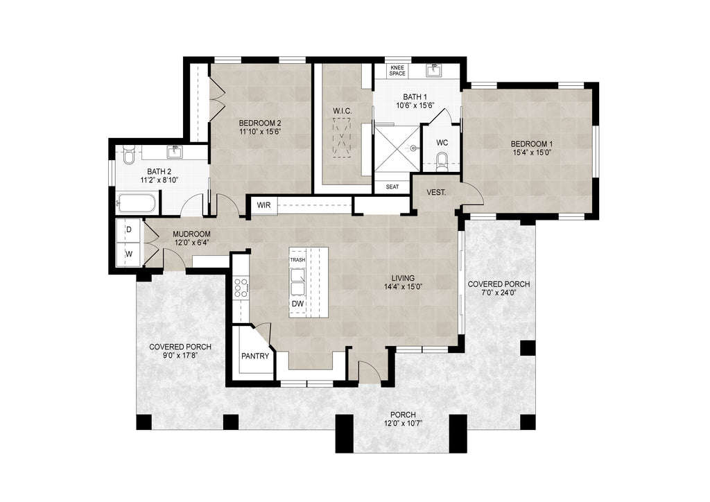 Inside, the open floor plan boasts 10' ceilings, a spacious keeping/family room, and a well-equipped kitchen with a walk-in pantry and generous prep space. A mudroom and walk-in closets add convenience and storage, while the split-bedroom layout ensures privacy for both suites. With slab foundation construction and efficient 2x4 framing, this plan combines affordability with elegance—perfect for homeowners seeking a cozy yet versatile home.