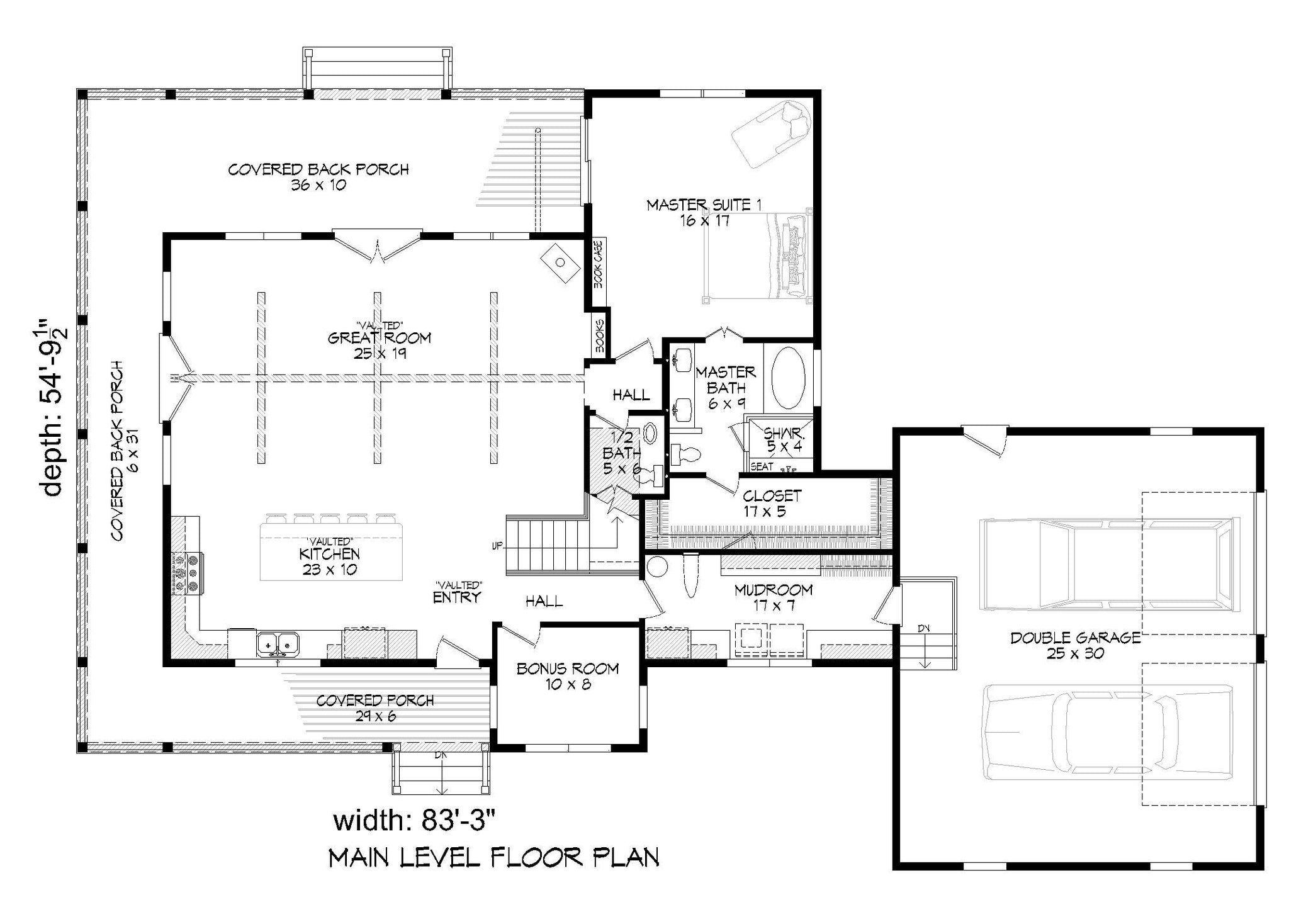Set on a footprint of 83'3" wide by 54'9.5" deep, the plan includes 803 sq ft of garage space with side-load bays and a generous 782 sq ft of porch area — including a welcoming wraparound porch perfect for relaxing outdoors. Bonus room and loft space upstairs provide flexible options for an office, playroom, or studio. Designed with 9' ceilings on the main level and 8' on the second floor, this home delivers both style and comfort with the perfect farmhouse flair.
