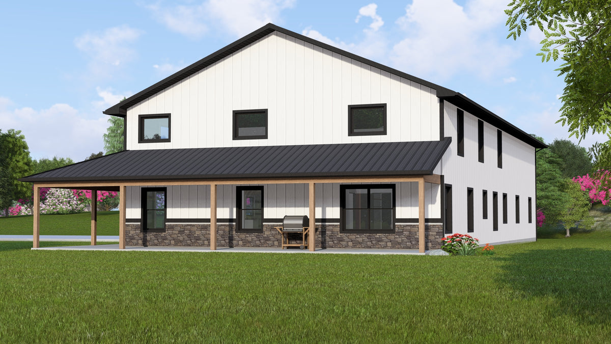 Additional features include a large 612 sq ft covered porch, an attached front-load 2-car garage (1,200 sq ft), and 2x6 wall framing on a slab foundation. With 8' ceilings on both floors and a balanced 5:12 roof pitch, this home delivers both comfort and curb appeal.