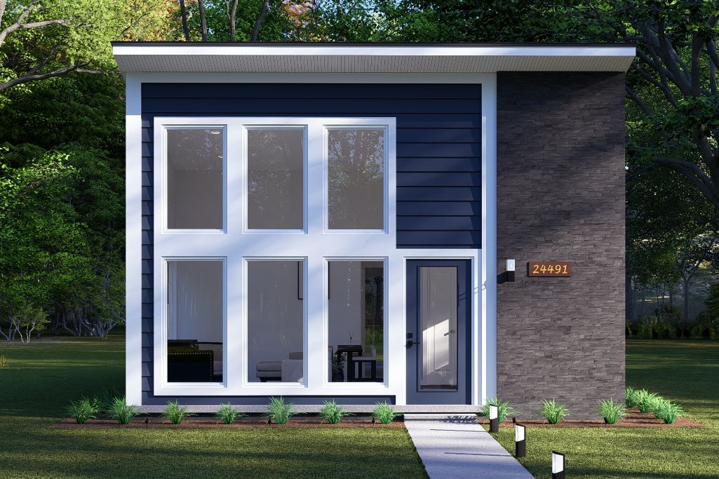 This 627-square-foot, two-bedroom home combines functionality and simplicity within a compact design. The open-concept layout maximizes the main living area, creating a seamless connection between the kitchen and living space, perfect for a cozy yet airy feel. Both bedrooms are conveniently clustered, each equipped with a walk-in closet to provide ample storage.