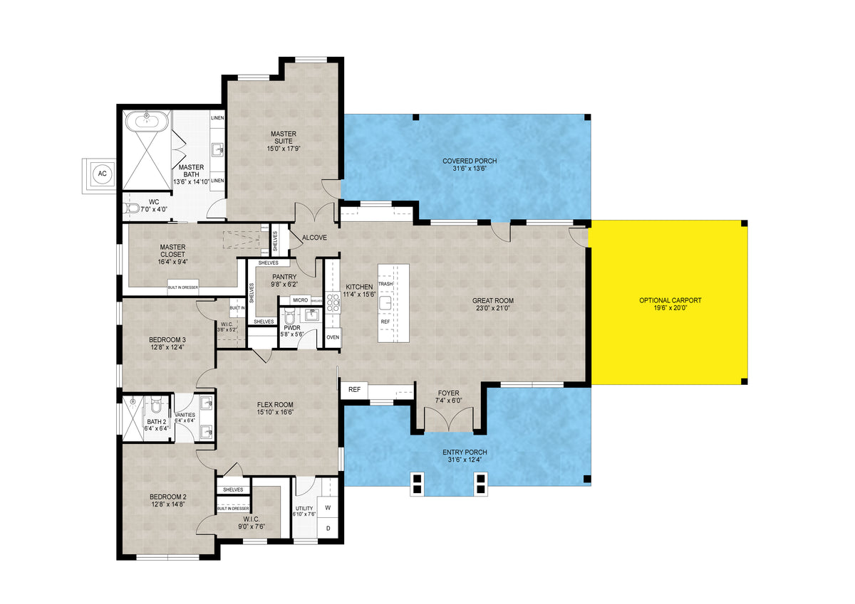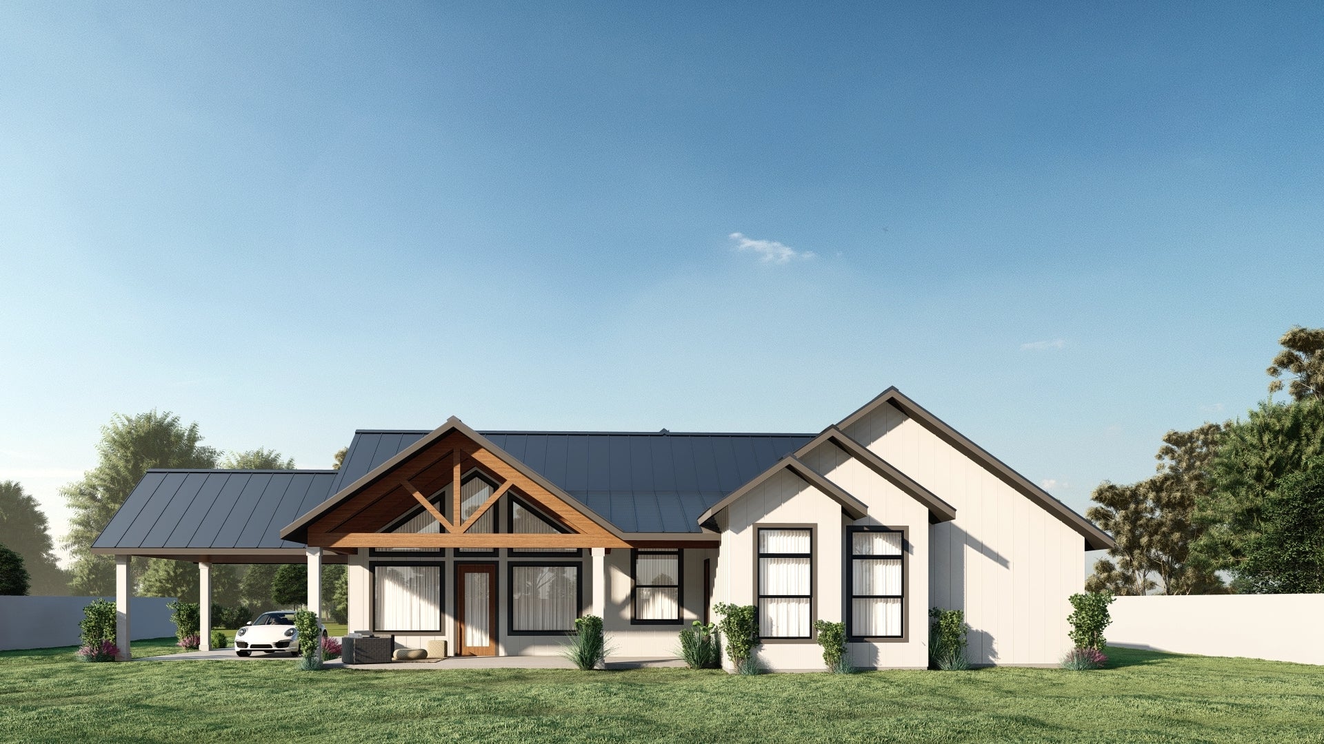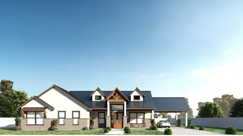 Set on a slab foundation with 2x4 wall framing and stick roof framing (8:12 pitch), this home is both durable and energy-efficient. Outdoor living is equally impressive with a 353 sq ft covered front porch, a 406 sq ft rear patio, and a 2-car side-load carport (419 sq ft)—blending charm and practicality. At 80'5" wide and 63'9" deep, this plan offers plenty of room to live, relax, and grow. With features like first-floor laundry, private master suite, and multiple flexible living areas, this home is ideal for families who value both comfort and versatility in a thoughtfully crafted design.