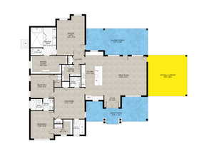 This beautifully designed 3-bedroom, 2.5-bath ranch-style home delivers 2,449 sq ft of well-planned, single-level living. With a generous 10' ceiling height, the open-concept layout features a large great room, kitchen with island, and walk-in pantry—perfect for daily living and entertaining. A split-bedroom design enhances privacy, placing the primary suite in its own wing complete with a private bath and walk-in closet. Two secondary bedrooms share a convenient Jack and Jill bathroom, while a flex room and den provide space for a home office, hobby room, or play area.