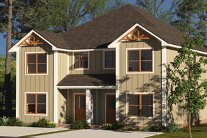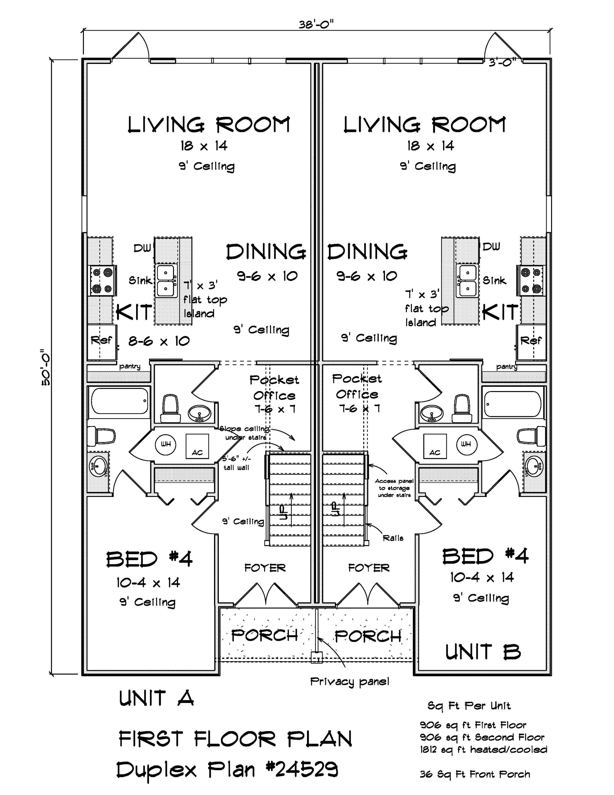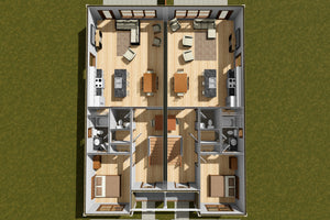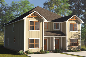 The thoughtfully designed layout includes a private master suite on the second floor with a double vanity bath, a functional loft space ideal for a media room or study, and a centrally placed kitchen island that flows into an open-concept family area. With front porch charm, second-floor laundry, and a home office/study in each unit, this duplex blends modern living with practical features for today's families—all within a narrow 38-foot-wide footprint.