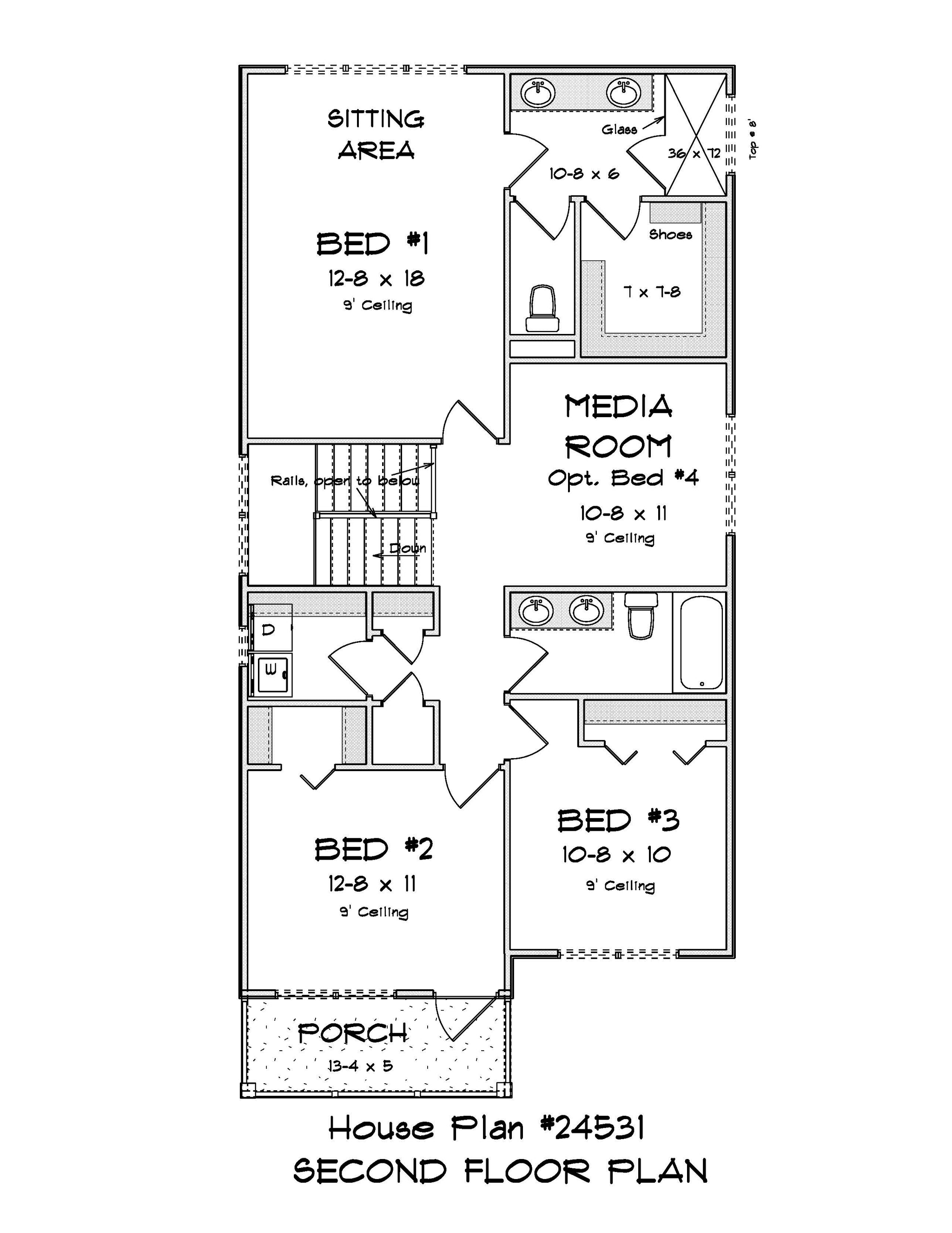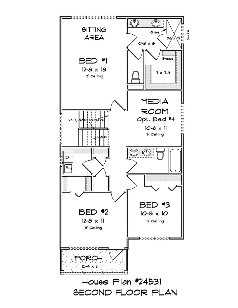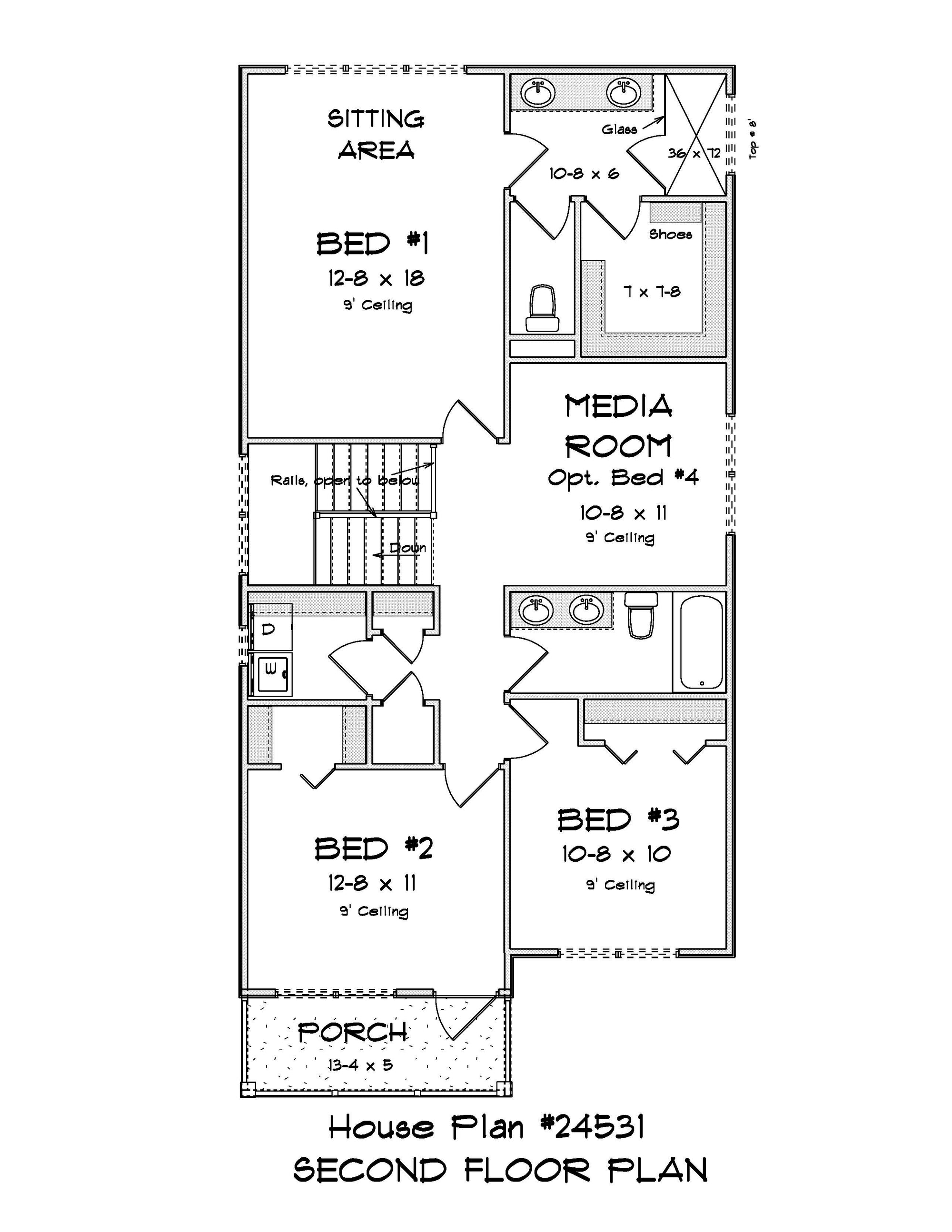 The main floor features a welcoming flex room, perfect for a home office or play area, and an open-concept kitchen with an island and walk-in pantry that flows into the living and dining areas. Upstairs, enjoy a private master suite with a sitting area, double vanity bath, and generous walk-in closet. The second floor also includes a spacious media room and conveniently located laundry. Charming front porch appeal and a smart layout make this plan a standout choice for today’s lifestyle.