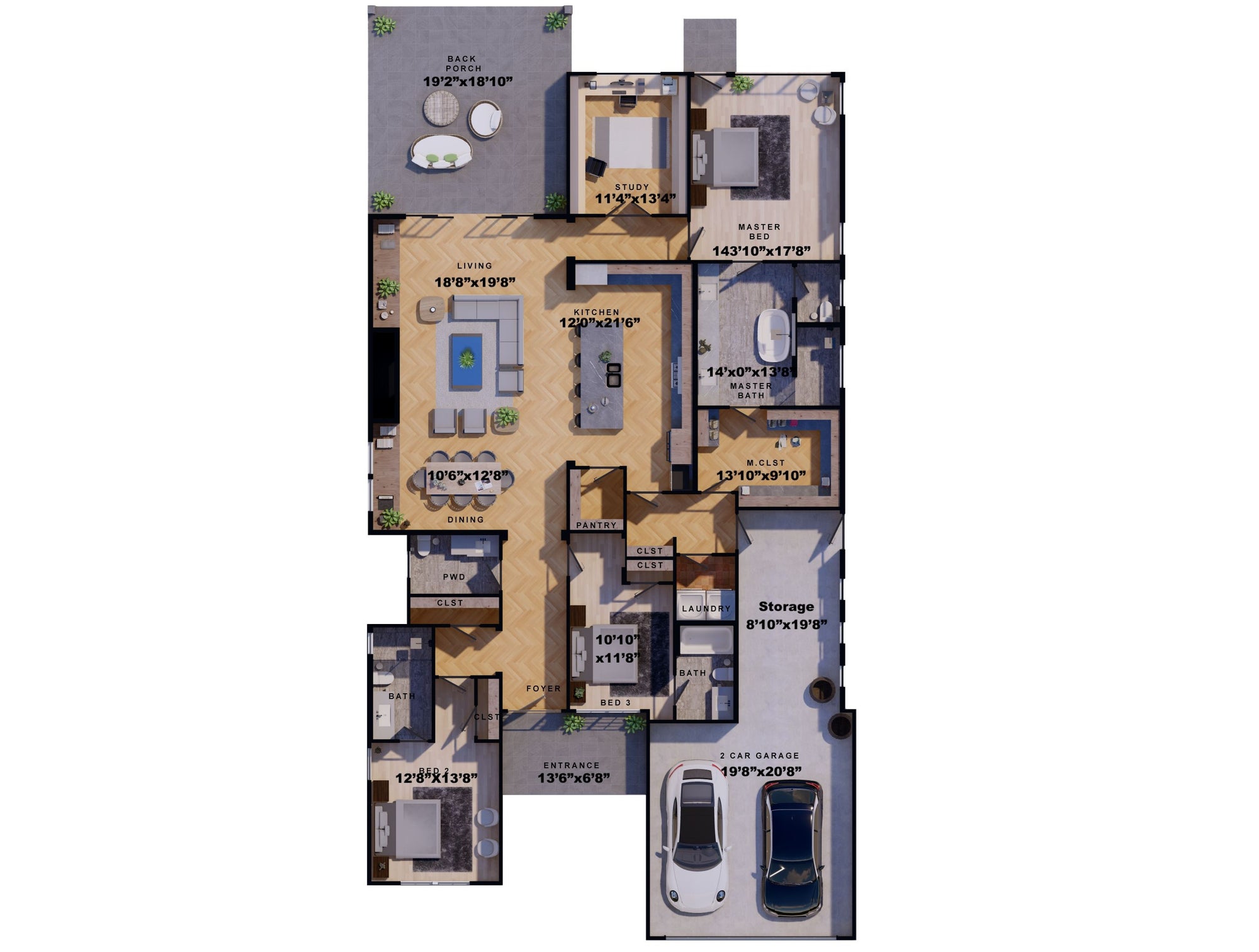 An impressive two-story grand room serves as the heart of the home, seamlessly connecting to the kitchen with an island, walk-in pantry, and dining area. A home office/study offers a quiet space for work or creative pursuits. Everyday convenience is enhanced with a mudroom and first-floor laundry. Outdoor living is just as inviting, with a 90 sq. ft. covered front porch and a covered back porch, perfect for relaxing or entertaining.