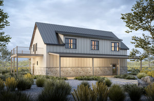 This barn-style garage apartment offers 1,450 sq. ft. of heated living space located entirely on the second floor, set above a spacious 1,515 sq. ft. 4-car garage. With 2 bedrooms and 1 full bath, this design is perfect for guest quarters, rental income, or multi-generational living. The home's footprint measures 62'6" wide by 54' deep, and the overall height reaches 29'6".