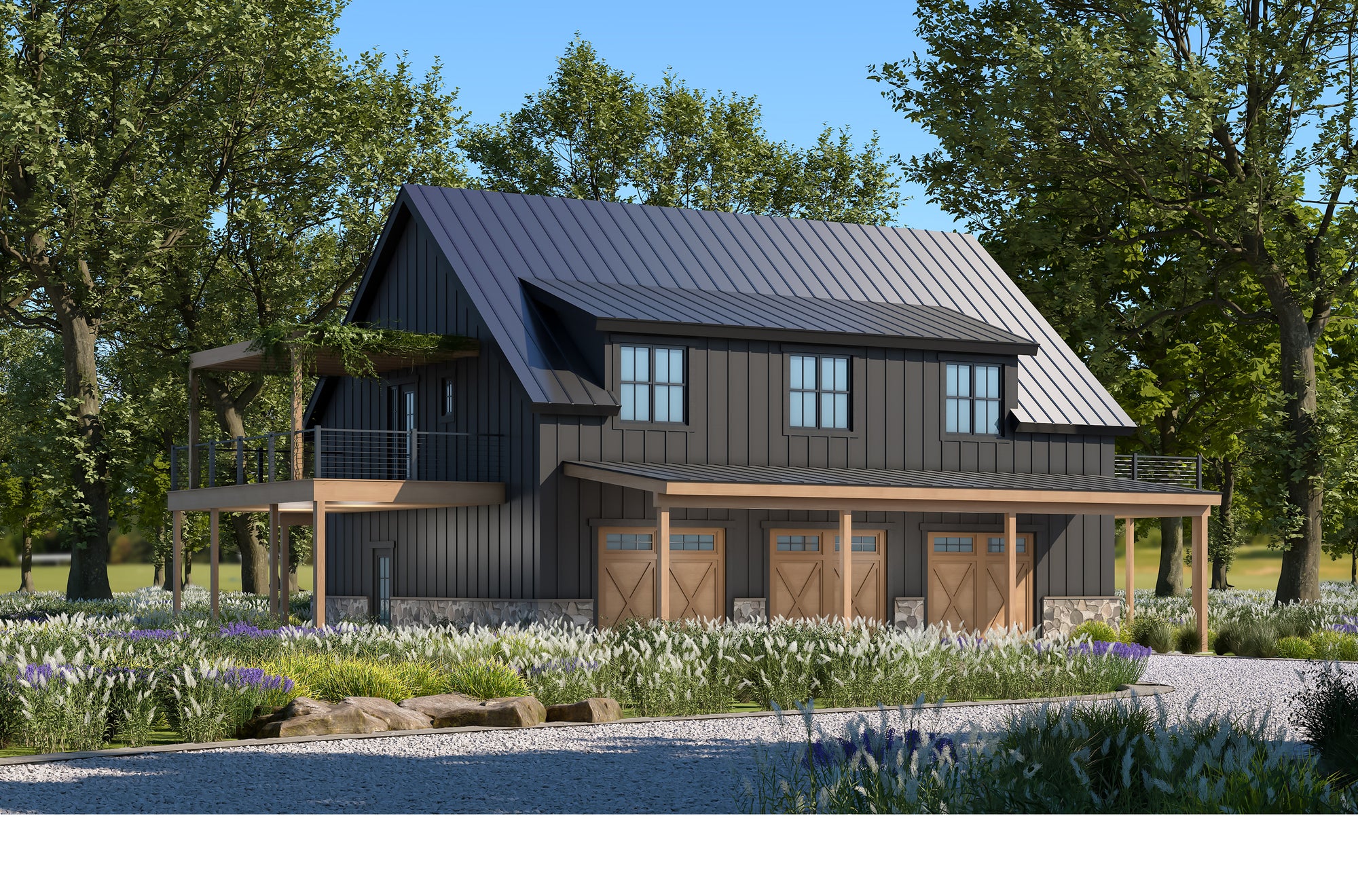 This versatile garage apartment design features a spacious 3-car garage on the main level and 1,619 sq. ft. of total living space. With a slab foundation and front-facing garage bays, the ground floor offers plenty of room for vehicles, hobbies, or even a workshop setup. A carport adds extra covered parking, while a small first-floor finished area provides entry access.
