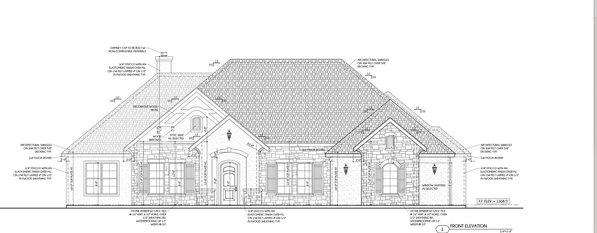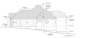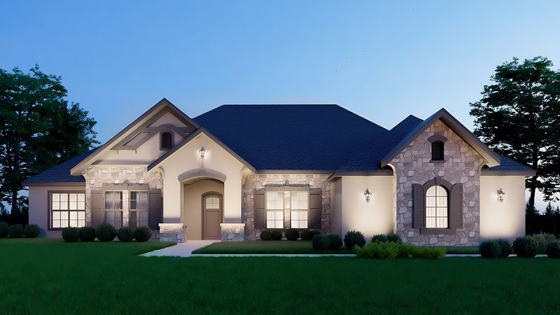This 2,877 sq ft European-style ranch home blends timeless charm with modern comfort in a spacious single-level layout. With a footprint measuring 75'8" wide by 73'7" deep, the home features refined exterior detailing, including a low-pitched 5:12 roof, covered front and back porches totaling 548 sq ft, and a side-load three-car garage offering 757 sq ft of storage and parking space.