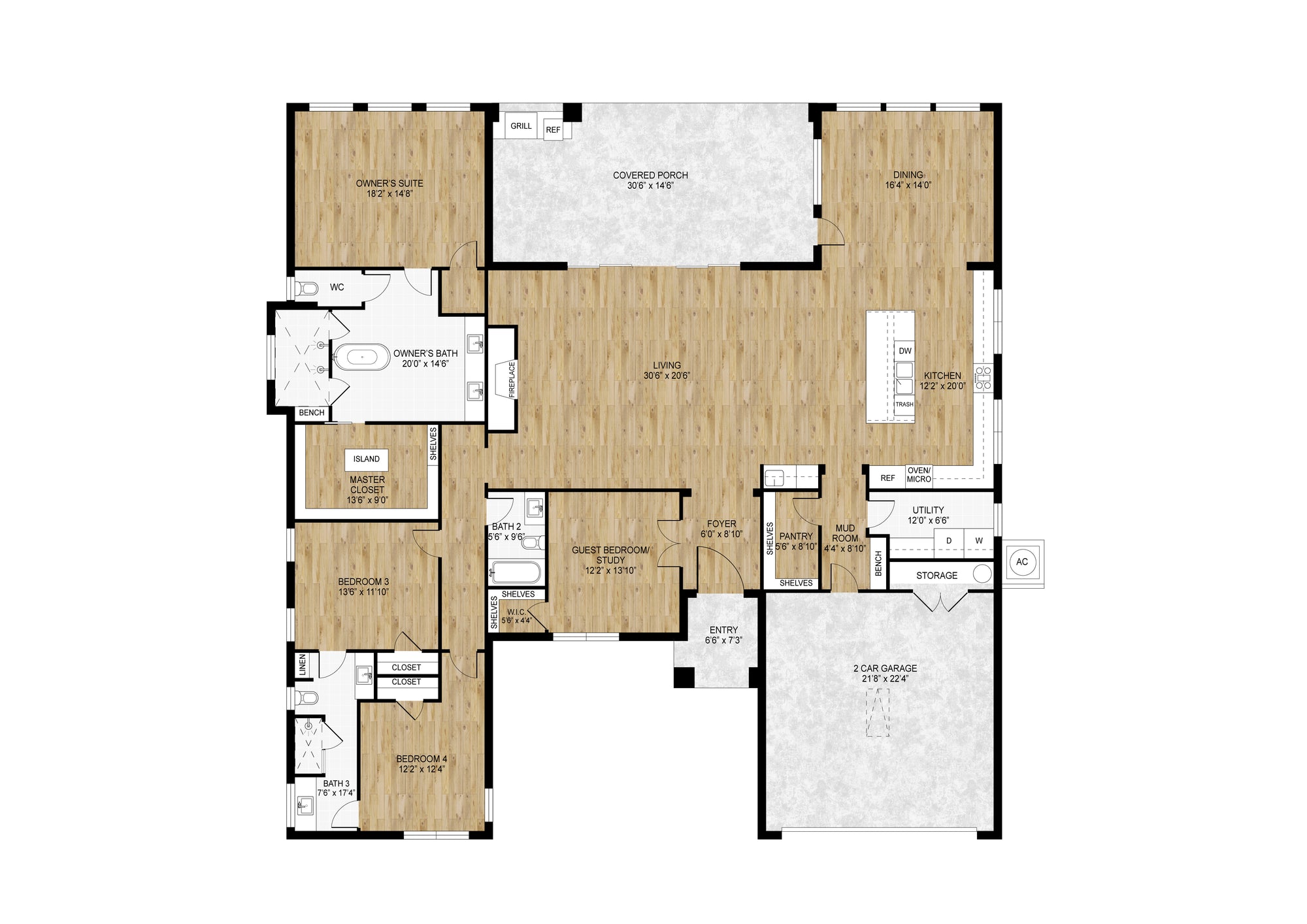 Experience single-level living at its finest with this 3,030 sq. ft. home, offering a thoughtful layout that blends style, comfort, and functionality. With 3 bedrooms and 3 bathrooms, this spacious design features a clustered bedroom arrangement for added privacy, including a first-floor master suite with a generous walk-in closet. A Jack and Jill bathroom connects the secondary bedrooms, making it ideal for families or guests. A dedicated home office/study and a flex room provide versatile space for working, relaxing, or hobbies.