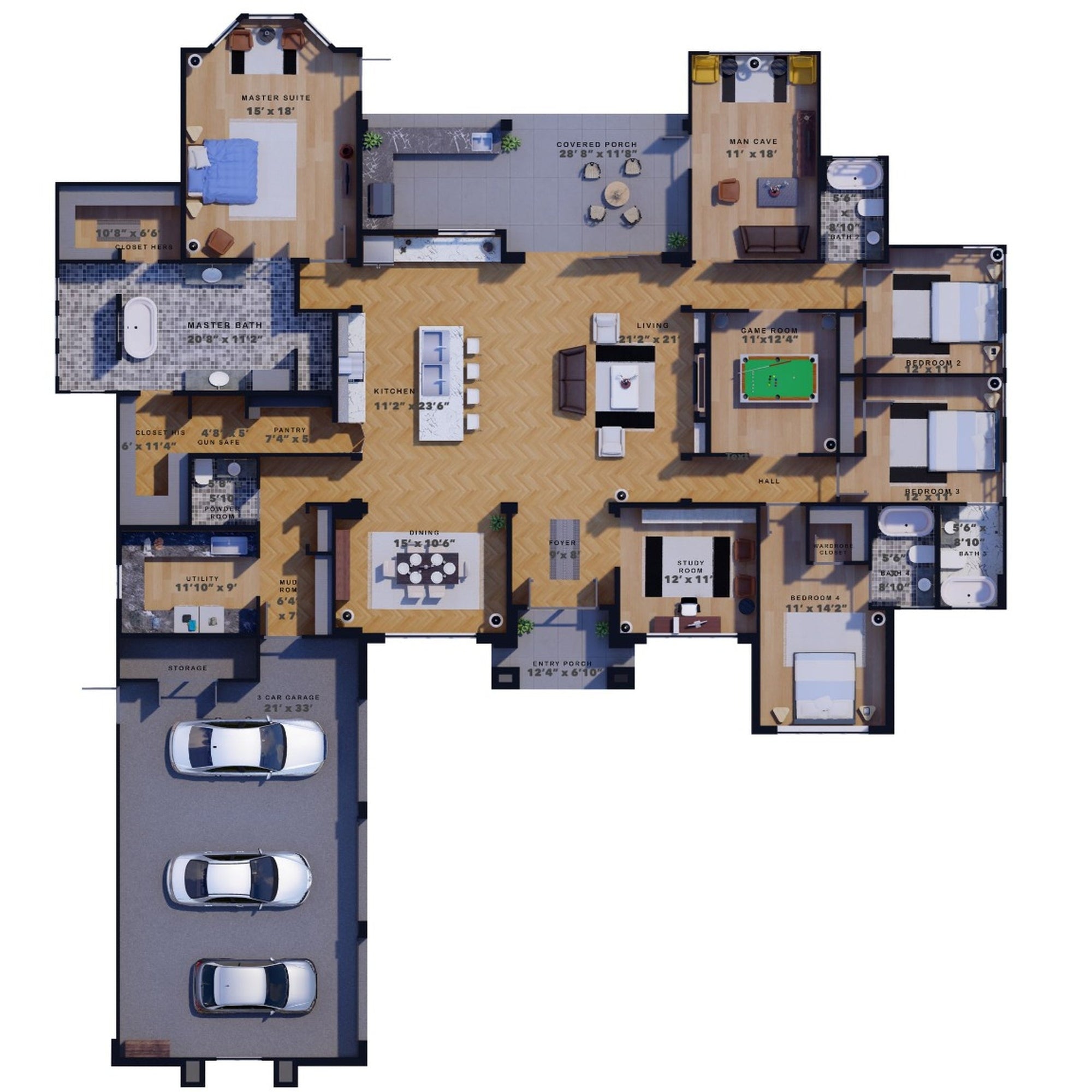 This 3454 sq ft home boasts a thoughtful and spacious design, ideal for both family living and entertaining. The entire first floor is designed to provide comfort and convenience, with an open layout that includes a formal dining room and a game room. The first-floor master suite offers privacy and luxury with its own sitting area, while the home office/study is perfect for those who need a dedicated workspace. A mudroom near the garage helps keep the rest of the home organized. The outdoor kitchen and rear porch provide an excellent space for outdoor dining and relaxation.