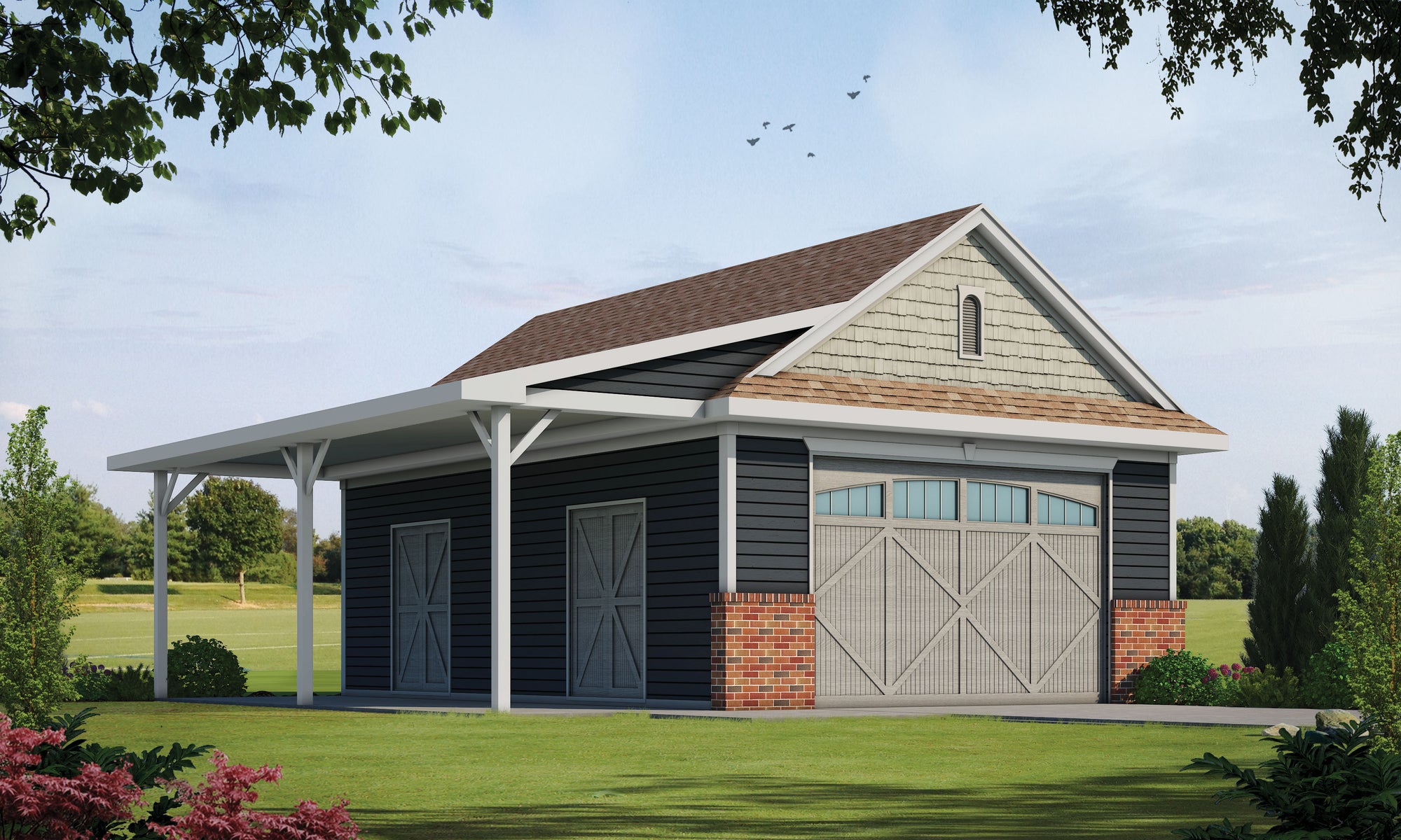 Beyond just vehicle storage, this design includes a 64 sq ft heated space thoughtfully configured as a bathroom and a covered patioâperfect for outdoor entertaining or convenient use when working outdoors. With 12-foot ceilings, 2x4 wall framing, and an 8:12 roof pitch, the structure blends utility and comfort, making it an ideal choice for homeowners seeking functionality with a touch of convenience.