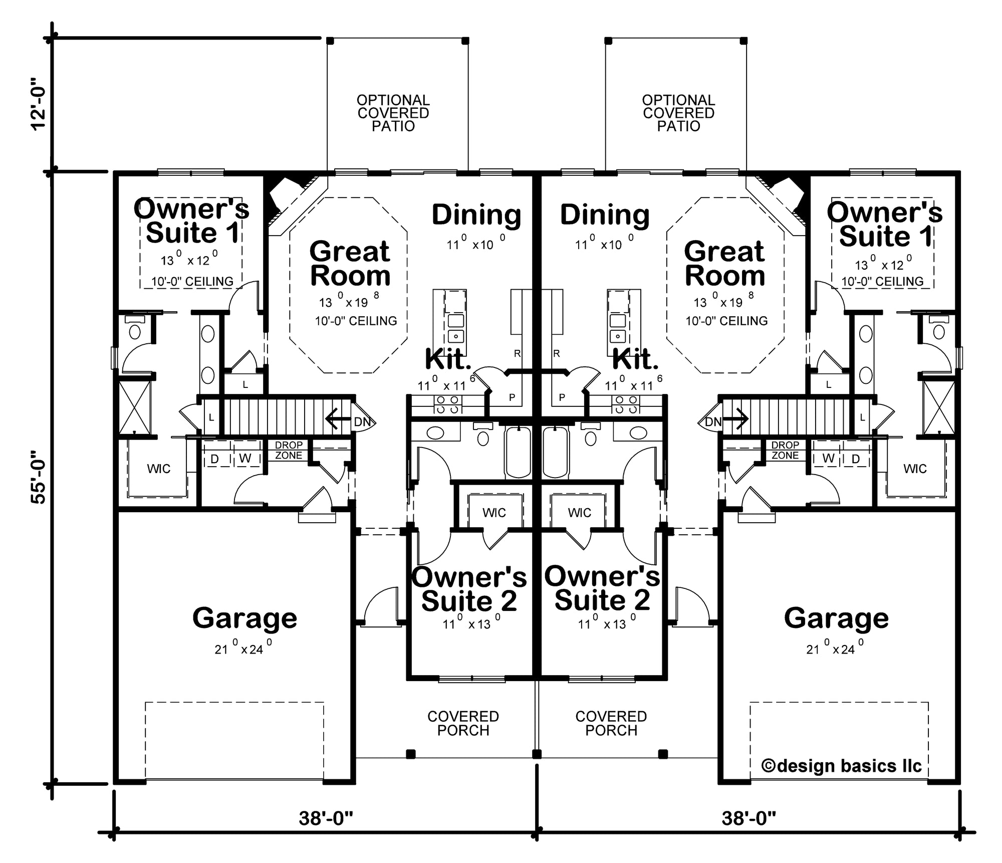Both units include a spacious 527 sq ft 2-car garage, covered front and rear porches, a cozy fireplace, walk-in closets, and a mud room for added convenience. With a 76' total width and 55' depth, this one-story slab foundation duplex combines efficiency, comfort, and curb appeal—ideal for extended families or rental income.