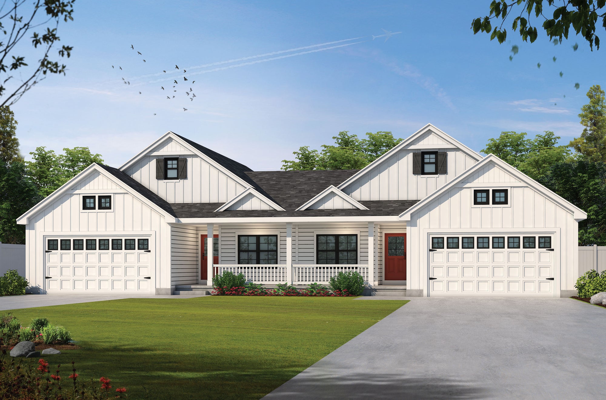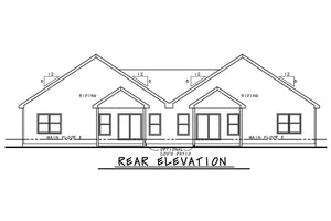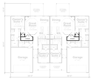 This stylish duplex house plan features two identical side-by-side units, each offering 1,387 sq ft of heated living space for a total of 2,774 sq ft. Each unit includes 2 bedrooms and 2 full bathrooms in a smart split-bedroom layout that maximizes privacy for the owner's suite. The heart of each home is an open-concept great room, kitchen, and dining area—perfect for entertaining or family living.