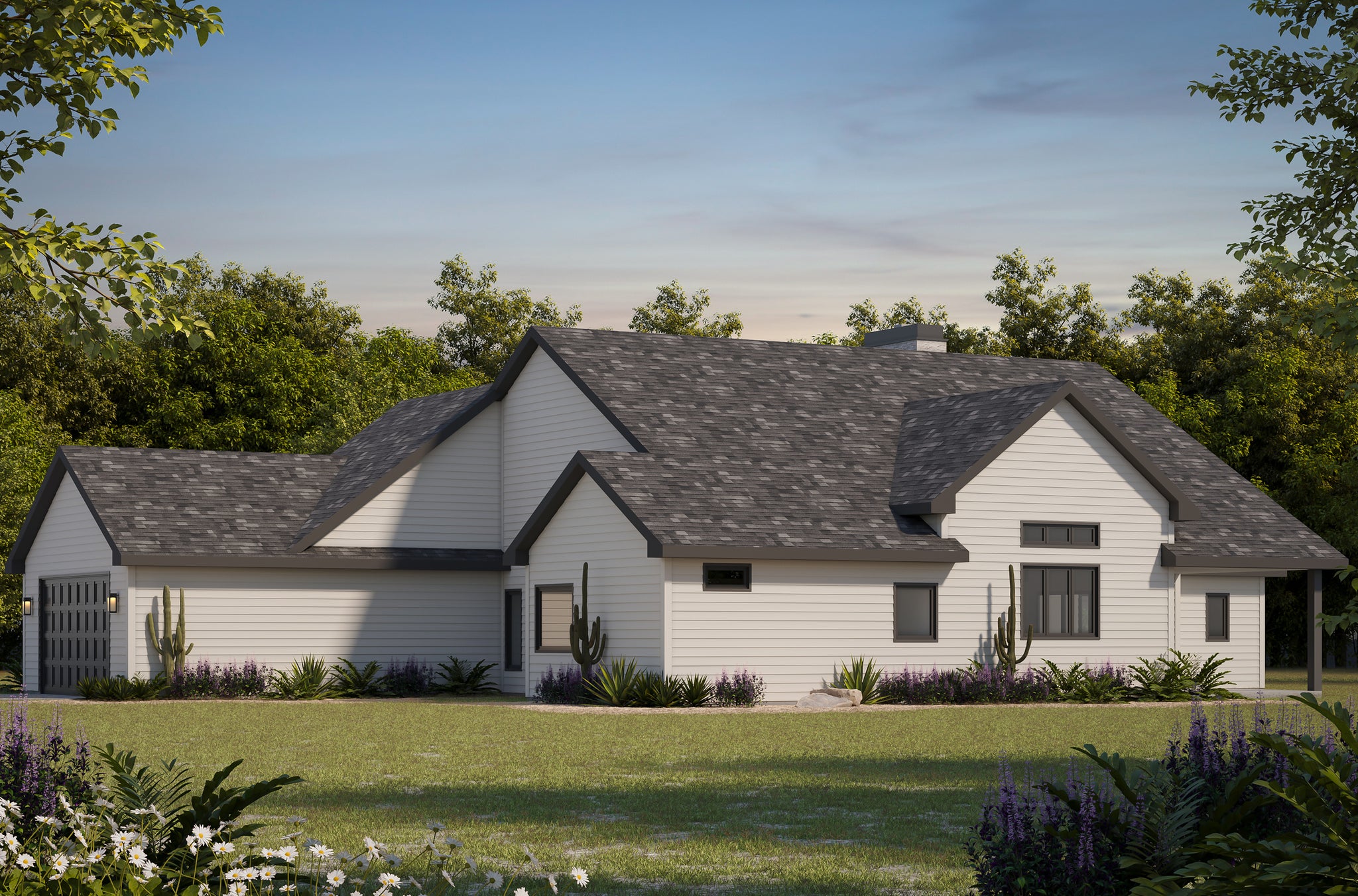 Additional highlights include a flex room, a dedicated home office/study, and a smartly placed mudroom off the side-entry 2-car garage. Relax outdoors on either the covered front or rear porch, and enjoy room to grow with the unfinished basement. With its wide façade, 7:12 roof pitch, and comfortable 9-foot ceilings, this ranch-style gem is perfect for families seeking comfort and flexibility in a stylish, farmhouse-inspired design.