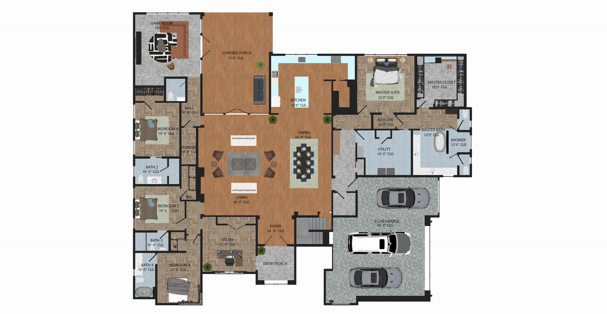 This luxurious 4-bedroom, 4.5-bath home delivers 4,641 square feet of finely crafted living space—all on one level. Designed for elegant everyday living and entertaining, the layout features a dramatic two-story grand room, a spacious open-concept kitchen with a walk-in pantry and island, and seamless indoor-outdoor flow to both covered front and back porches. A side-load 3-car garage (928 sq. ft.) and a large mud room offer convenience and storage without compromising style.
