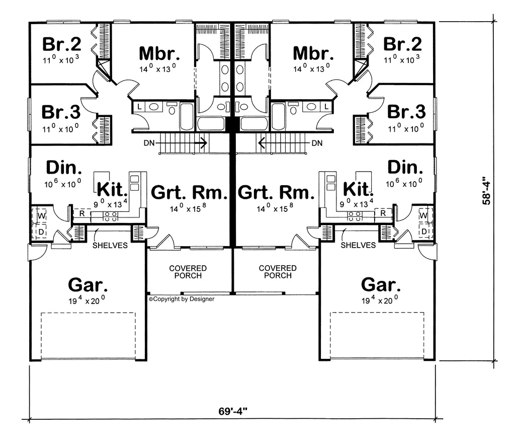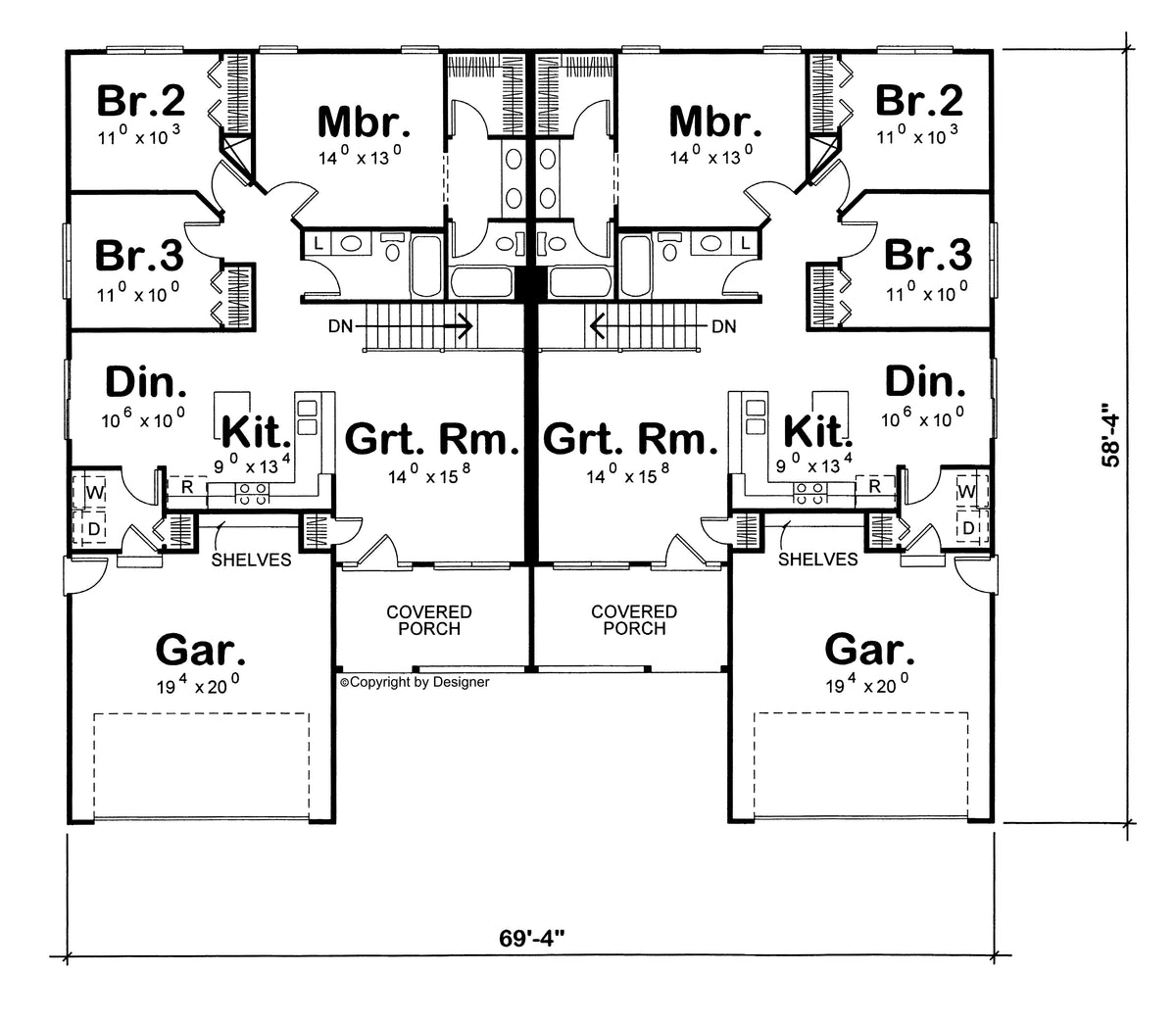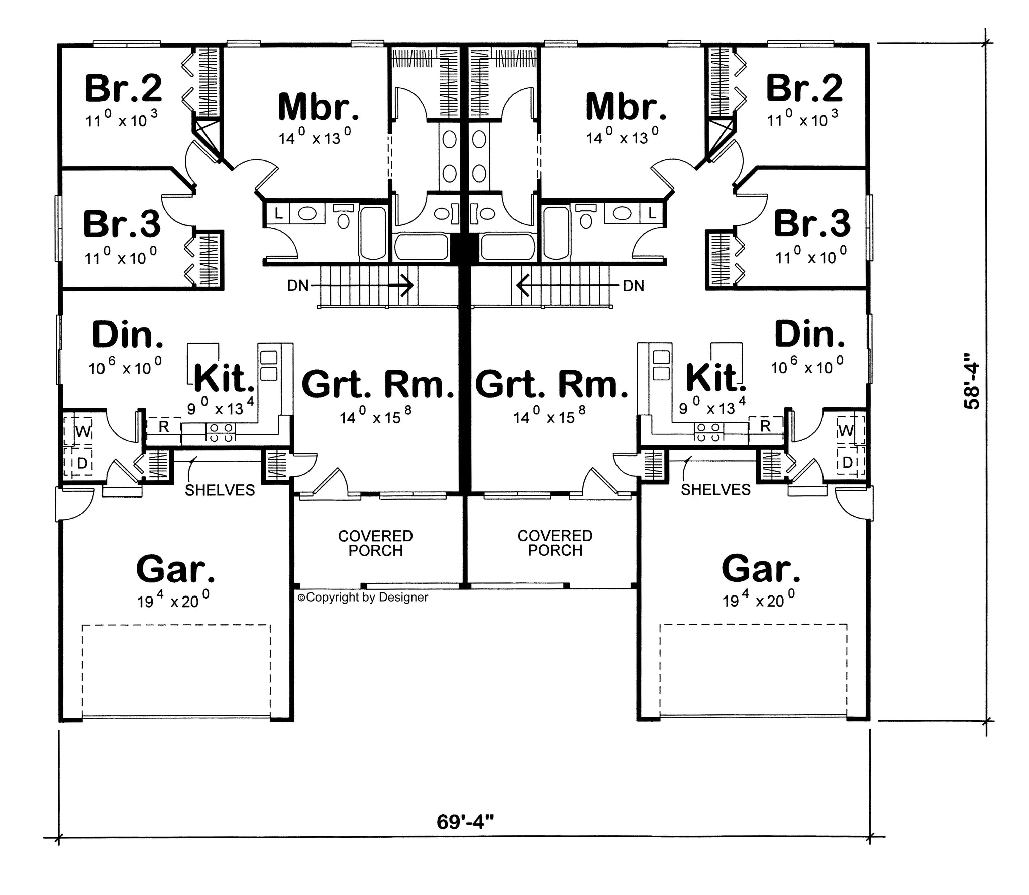 The open-concept floor plan in each unit seamlessly connects the great room, kitchen, and dining areas, perfect for everyday living and entertaining. Each kitchen is anchored by a generous island and includes plenty of storage space, including a pantry. The master suites are privately located with their own full baths, offering a relaxing retreat. A large covered front porch spans the front elevation, enhancing curb appeal and providing a welcoming outdoor space. Completing the design is a four-car front-load garage—two bays per unit—adding convenience and ample parking.