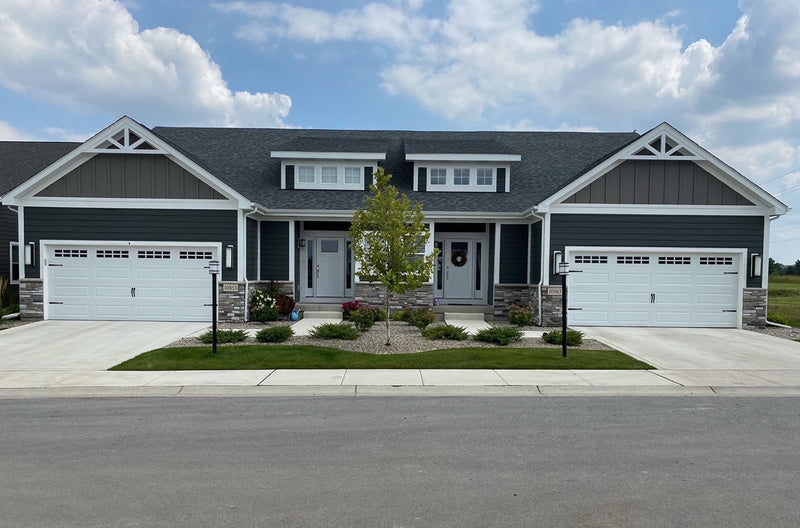 Each unit features a first-floor master suite complete with a sitting area, as well as open-concept living that connects the family room (with fireplace), kitchen island, and dining space. Upstairs, two additional bedrooms each have their own bathroom, making the layout ideal for families or guests. A dramatic two-story grand room adds volume and light to the heart of the home, and the mudroom and laundry room provide practical everyday convenience. This duplex blends elegant design with efficient use of space.